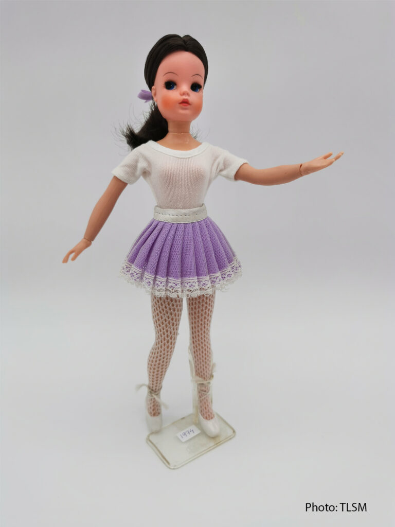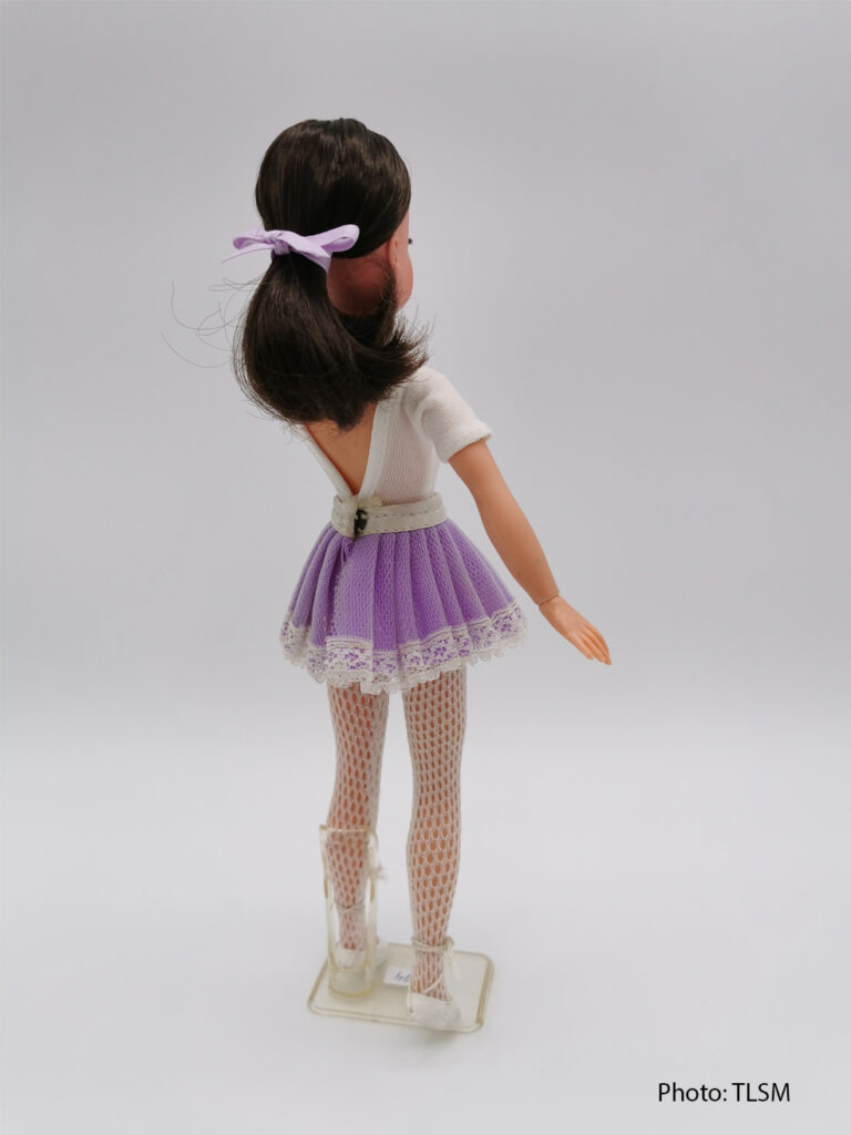 Her complete ballet outfit consists of a white leotard, fishnet tights and a removable lilac skirt. Without it, she can be a gymnast or a dancer in rehearsals. She also has a pair of moulded white rubber/plastic ballet shoes with silk cord to tie around her ankles.