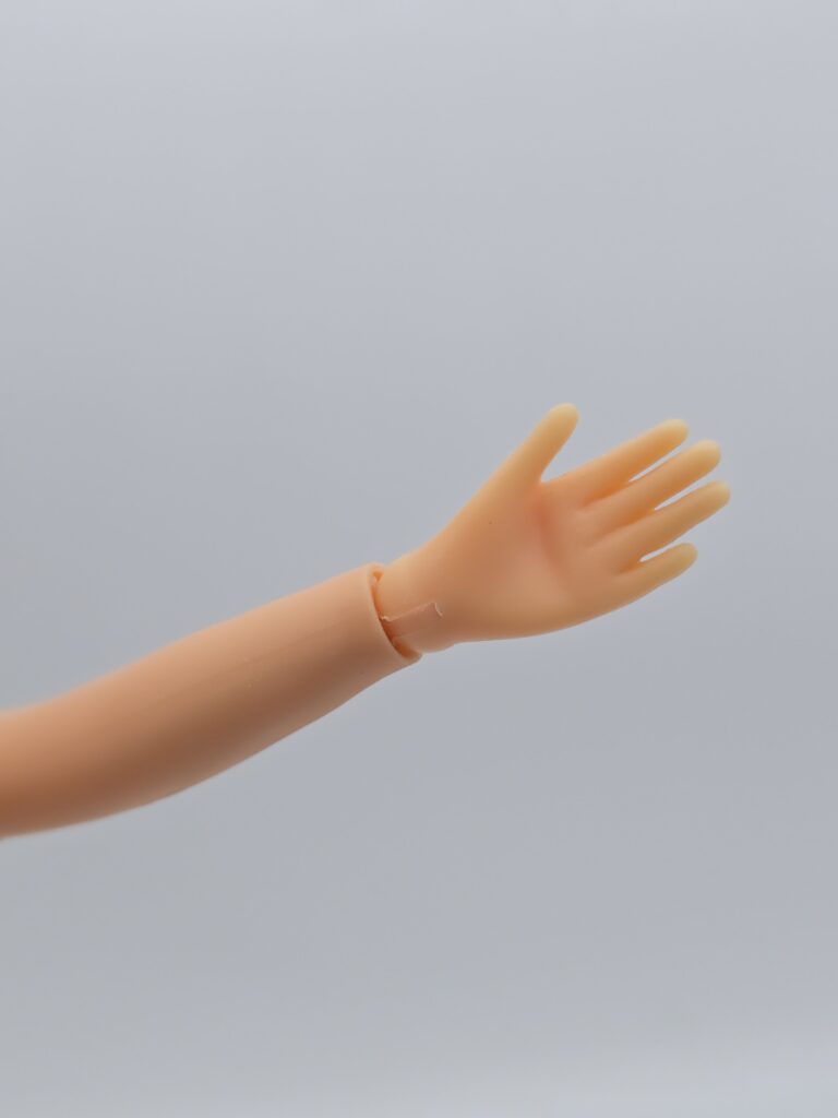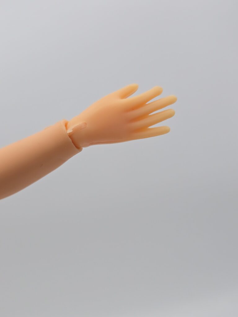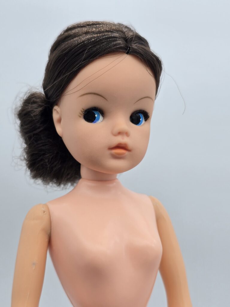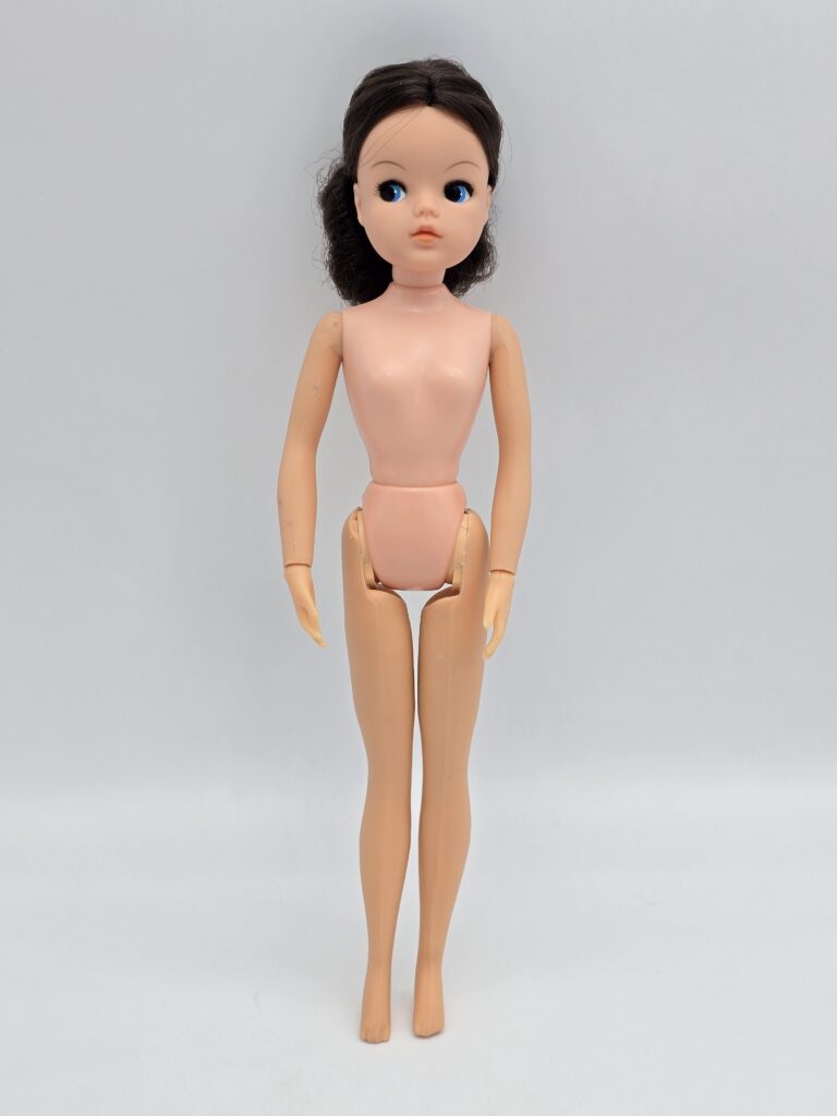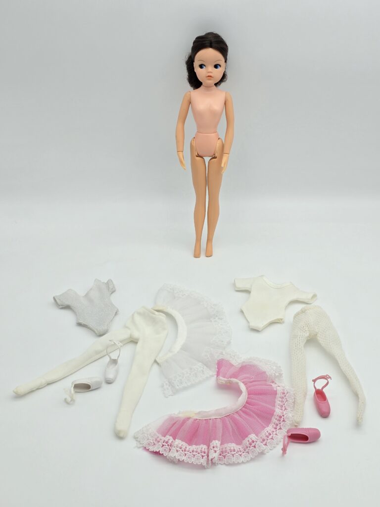 She has long rooted hair, and according to the 1984 Pedigree catalogue she is “dressed in pink with blonde hair or white with brunette hair”, with center part with pink or white ribbon (depending on her outfit) to hold her hair back in the typical Sindy styled pony tail. She has double neck joint, “all-rubber arms” with bending elbows, hinged hands, fully poseable waist, click-click knees and bending ankles.