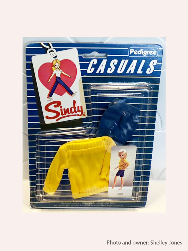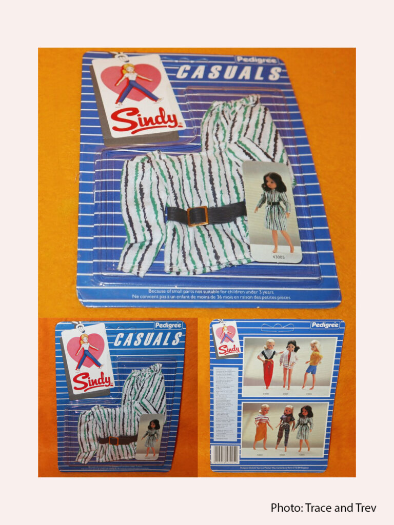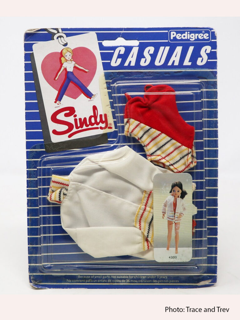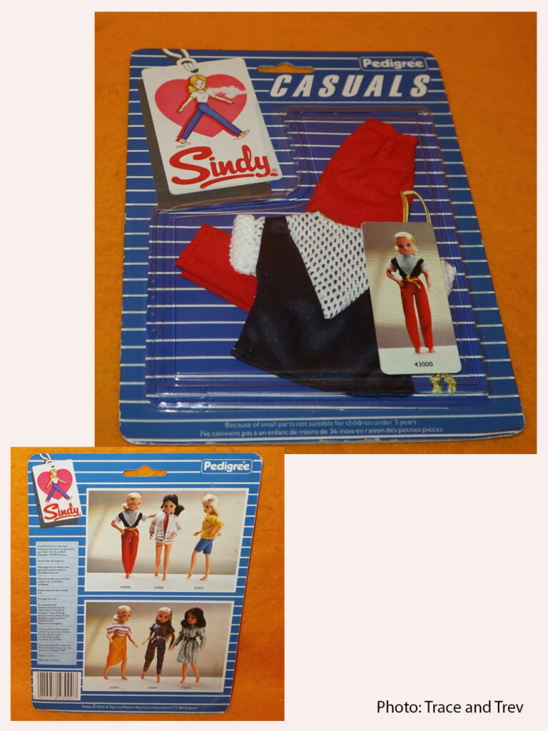 1984 Outfits: Casuals 1984 Outfits: Casuals A collage made of pictures from the 1984 Sindy Brochure. TraceAndTrev T Shirt and Trousers, 43000. TraceAndTrev Swimsuit and Jacket, 43001. A collage made of pictures from the 1984 Sindy Brochure. Jumper and Shorts, 43002. Top, Shorts and Skirt 43003 A collage made of pictures from the 1984 Sindy Brochure. Matching Trousers and Top 43004 TraceAndTrev Striped Skirt and Top, 43005. Thank you TraceAndTrev for sharing your photos!