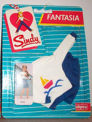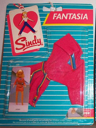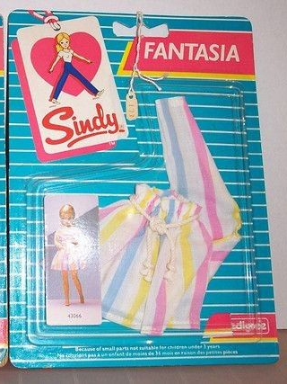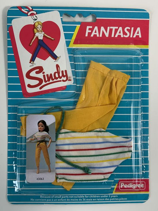 1985 Outfits: Fantasia 1985 Outfits: Fantasia A collage made of pictures from the 1985 Sindy Brochure. Pink Dress, 43061. Sweatshirt and Blue Shorts, 43062. Yellow Trousers and T Shirt, 43063. A collage made of pictures from the 1985 Sindy Brochure. Red Trousers and T-Shirt, 43064. Green Shorts and Top, 43065. Matching Dress and Top, 43066.