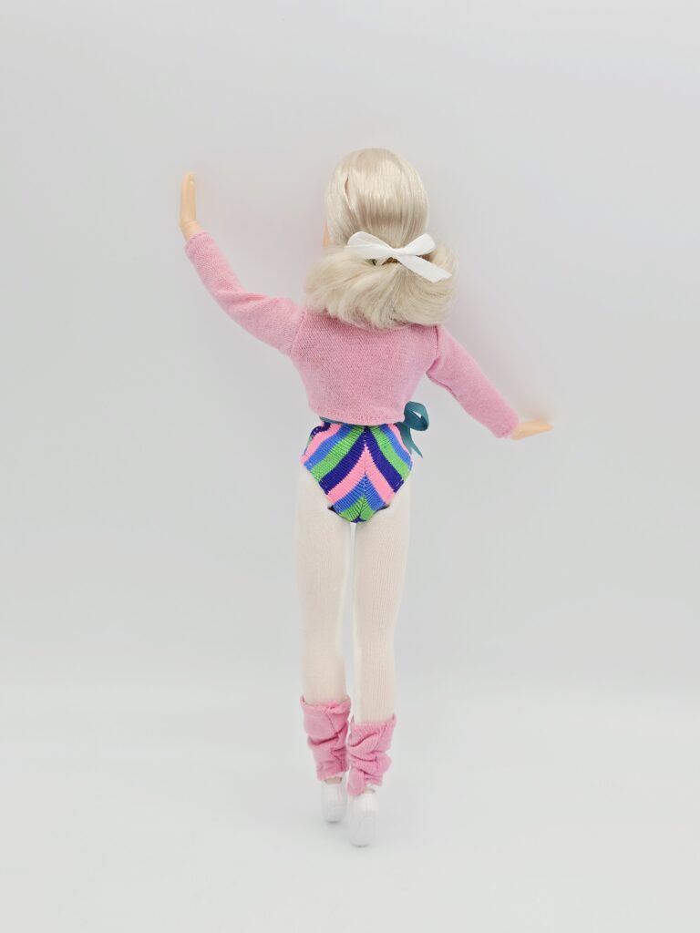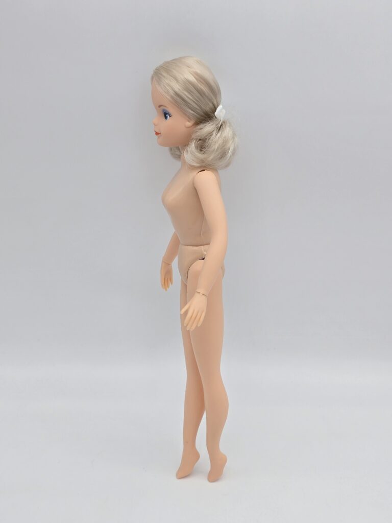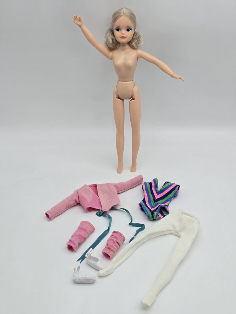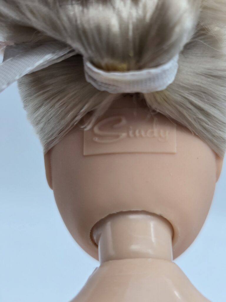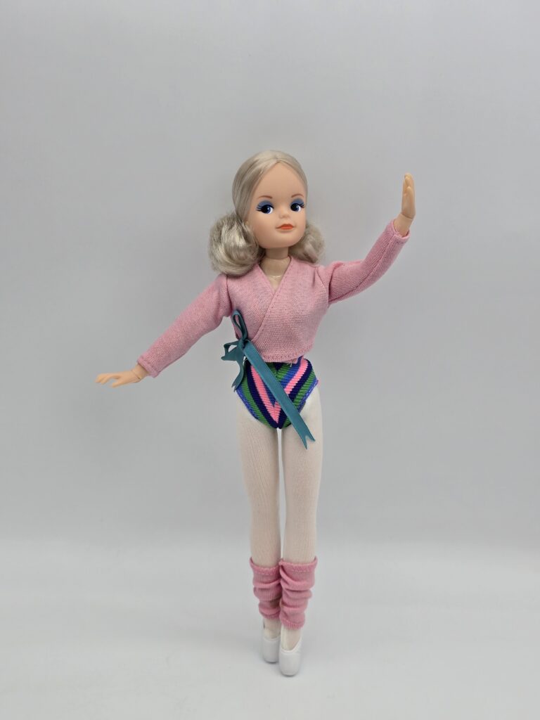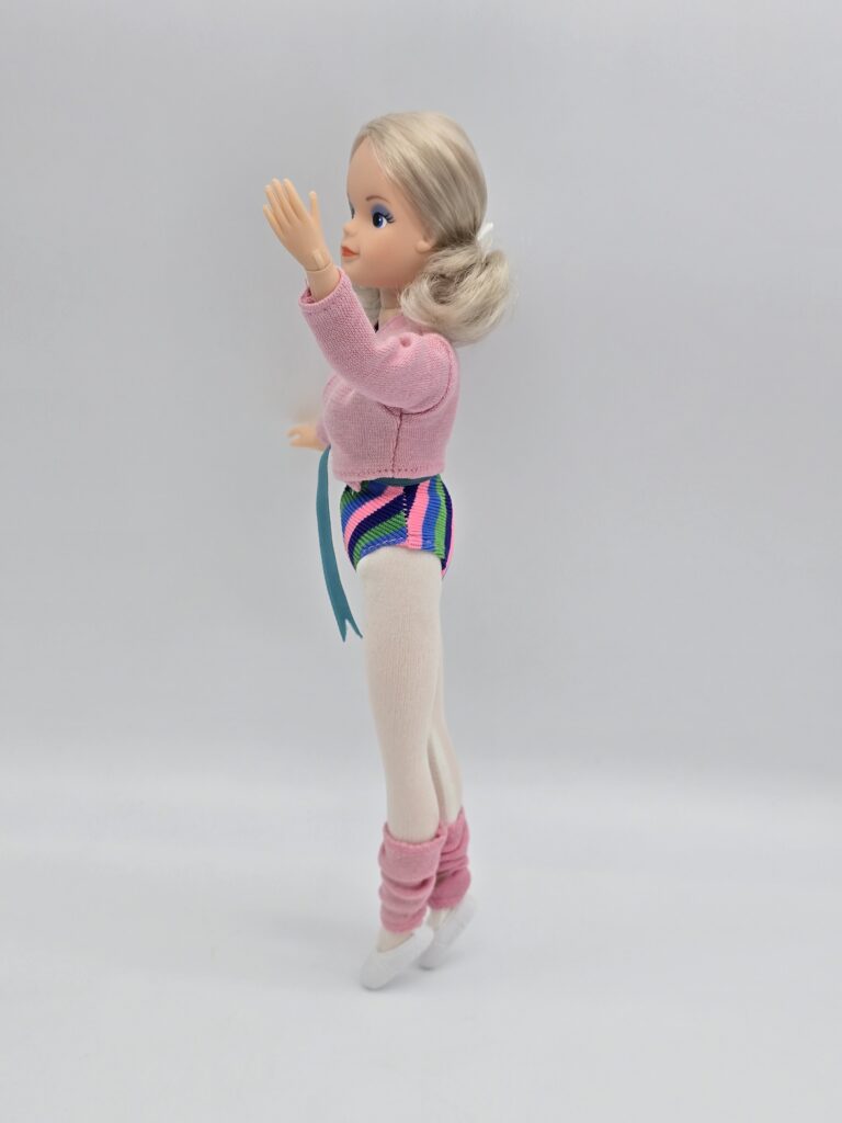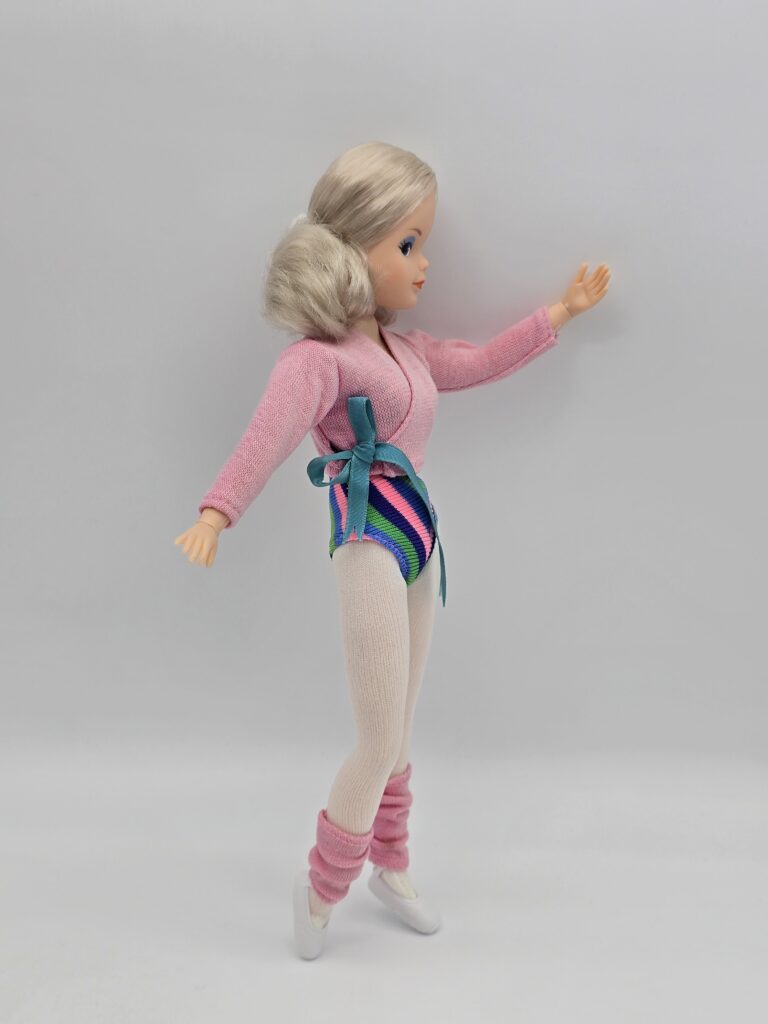 Ballerina Sindy has long rooted hair with center part and the classic Sindy ponytail, “Sindy” molded on the back of her head, movable head and neck, movble shoulders, moveable elbows, ‘double jointed’ waist, movable hips, click-click legs and movable ankles.