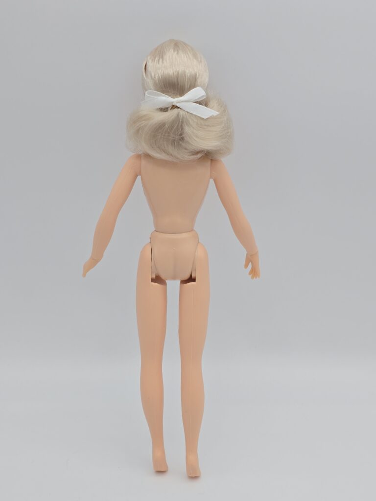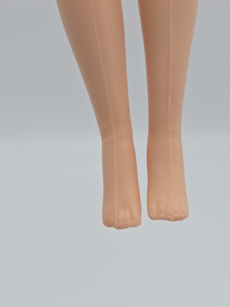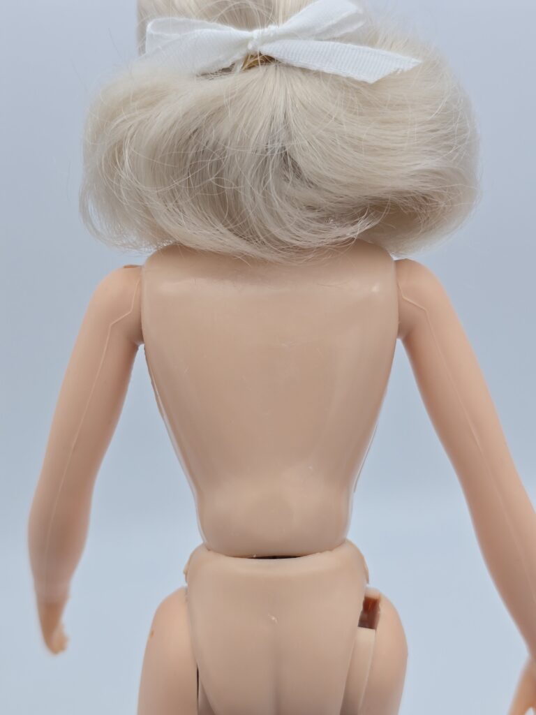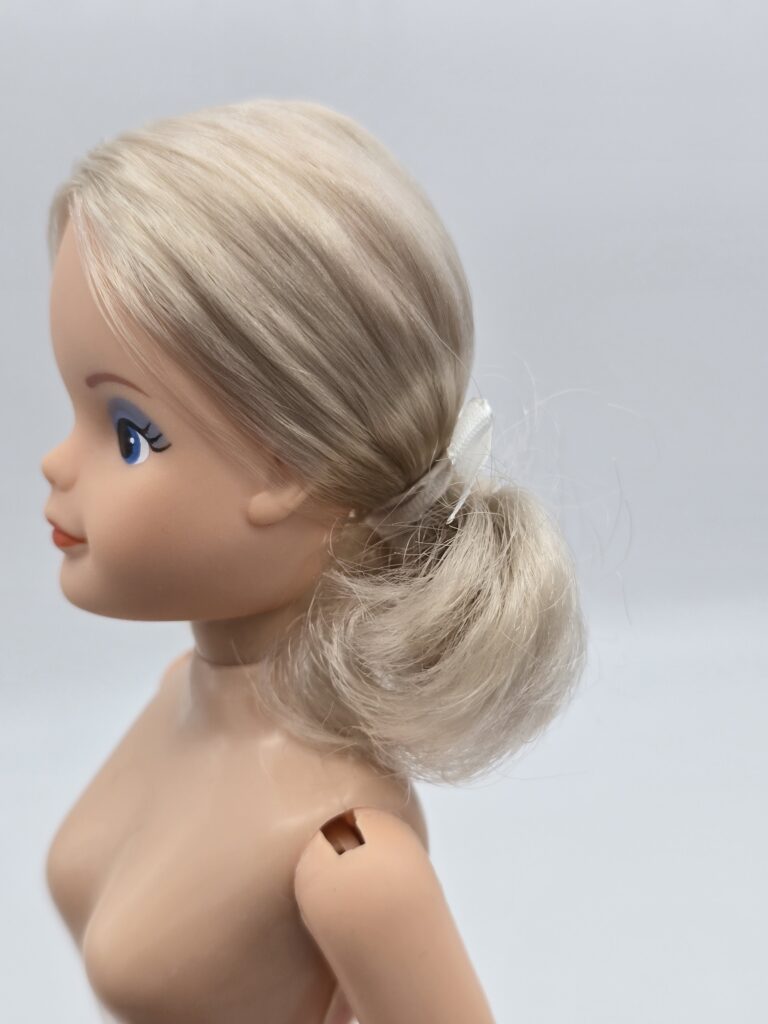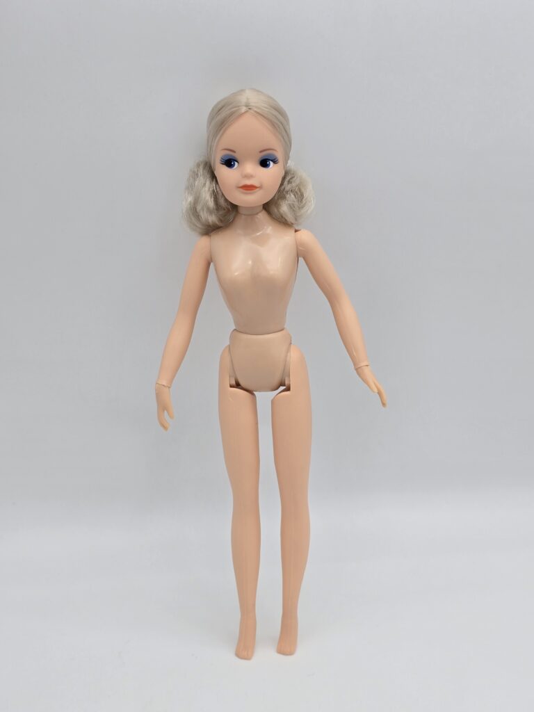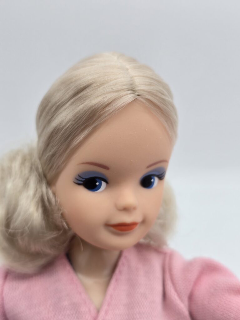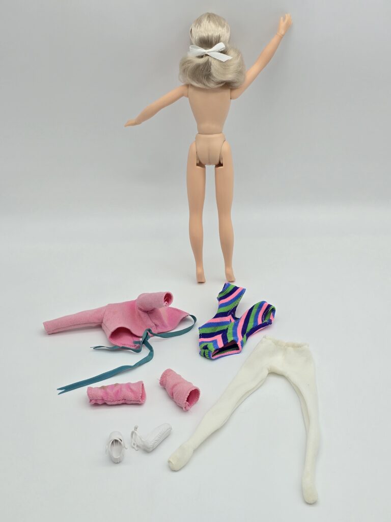 Ballerina Sindy has long rooted hair with center part and the classic Sindy ponytail, “Sindy” molded on the back of her head, movable head and neck, movble shoulders, moveable elbows, ‘double jointed’ waist, movable hips, click-click legs and movable ankles.