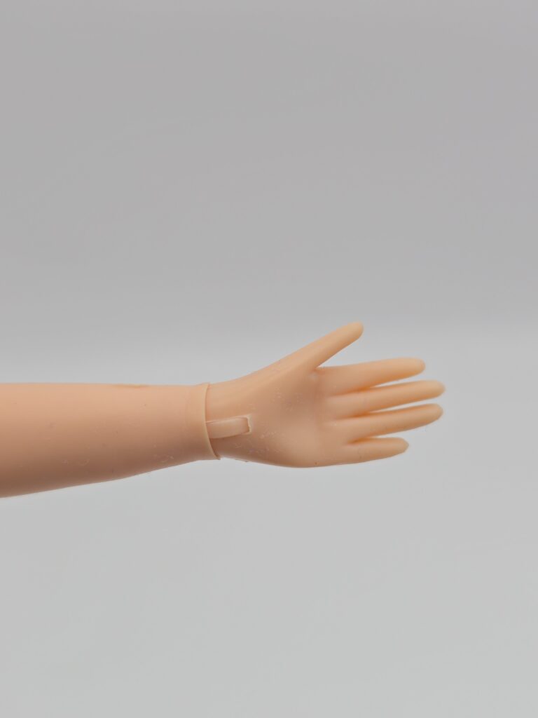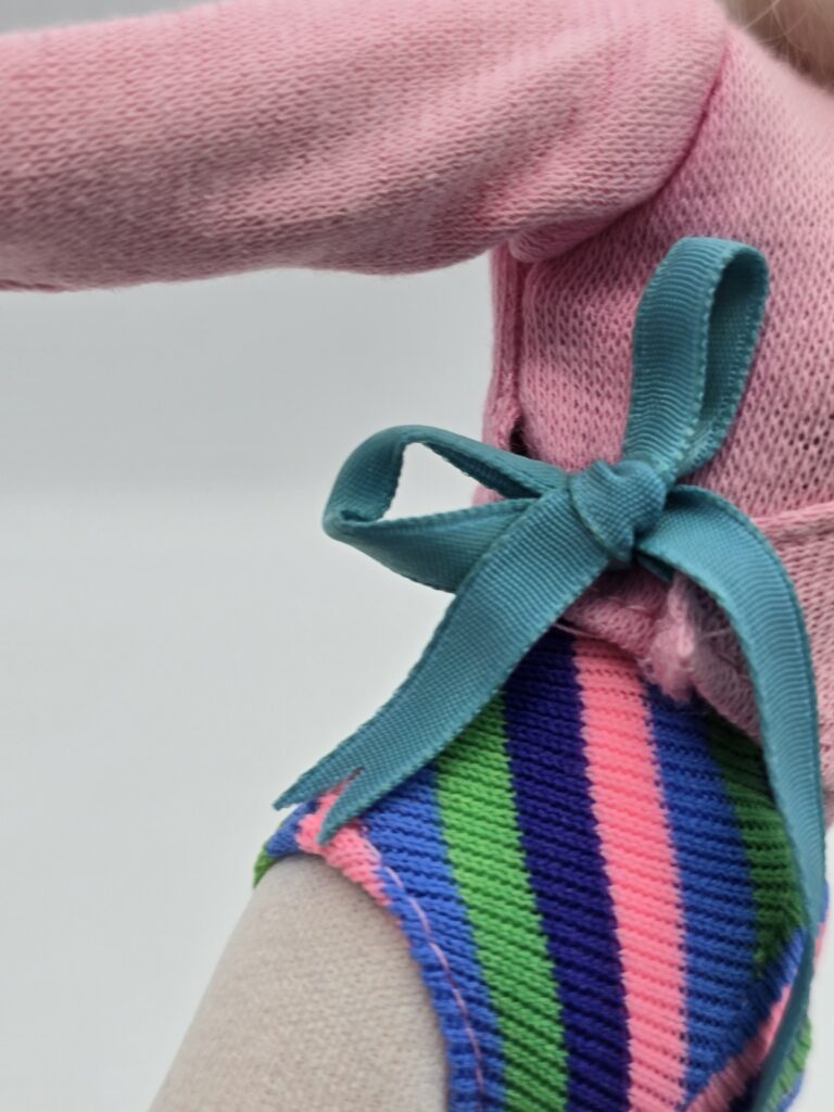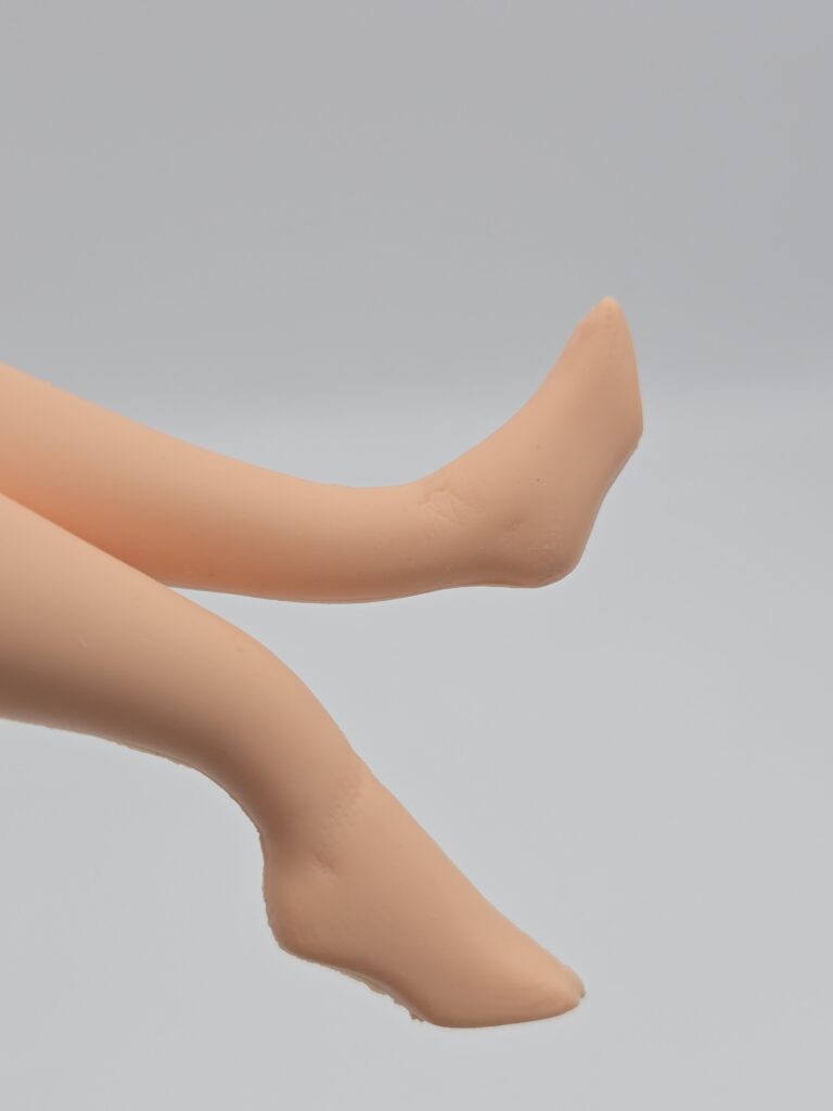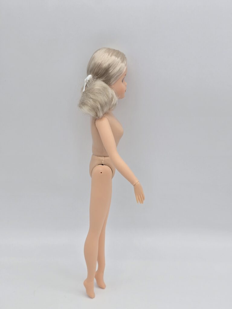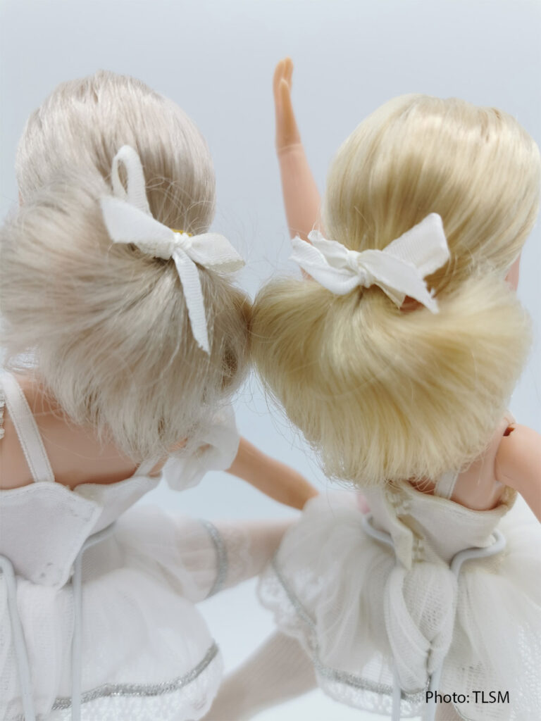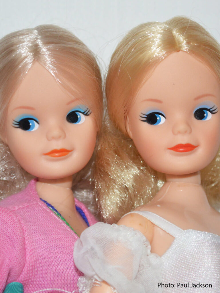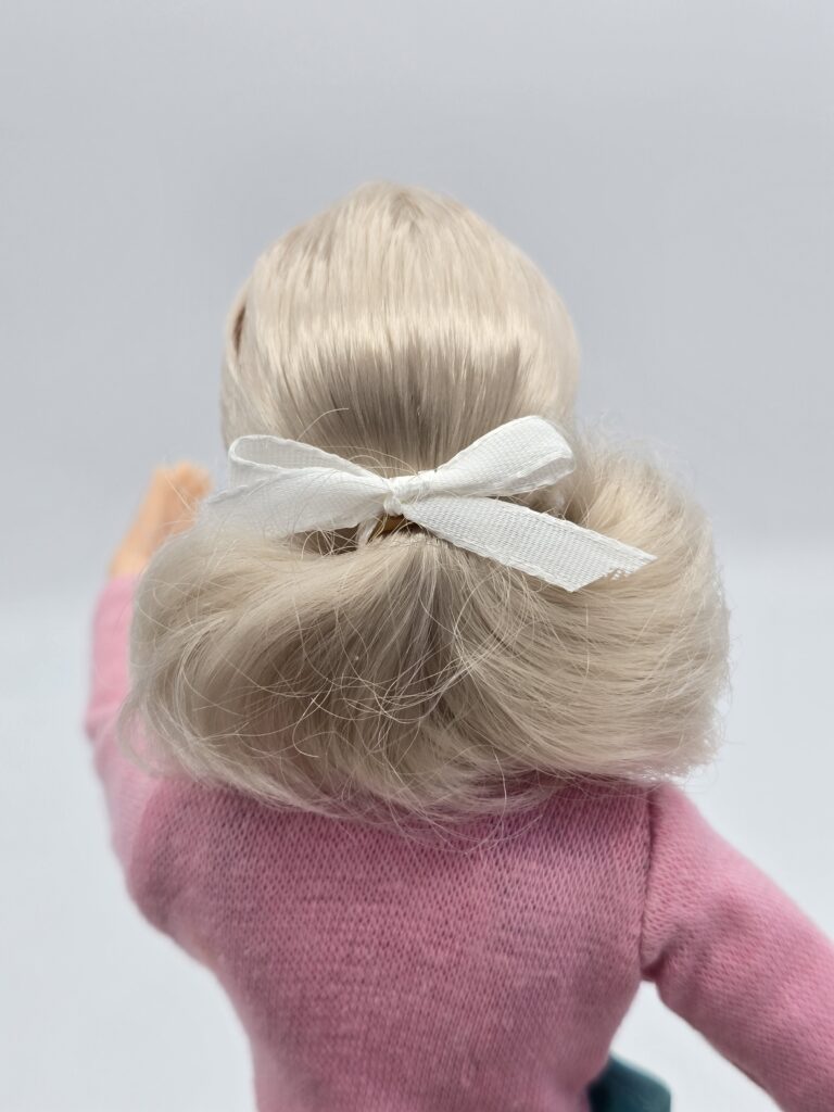 Ballerina Sindy has long rooted hair with center part and the classic Sindy ponytail, “Sindy” molded on the back of her head, movable head and neck, movble shoulders, moveable elbows, ‘double jointed’ waist, movable hips, click-click legs and movable ankles.