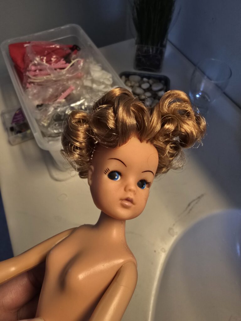 After the procedure above is done:Comb the hair and section it.Use some kind of material to keep the hair in place.Wrap it around the wet hair and stretch the material so the hair is straight inside it. Roll it on some hair rolls. I use needles to keep them at place.When all hair is done let it dry over night.This doll had very short eye lashes on her left eye.If you squeeze the eye it’s easier to reach the……lashes with a tweezers and very slowly and carefully drag them out a bit.It will look like this.Cut off the long hairs so both eyes have the same length of lashes.Like this.Remove the rolls.Comb the hair back and form her pony tail.