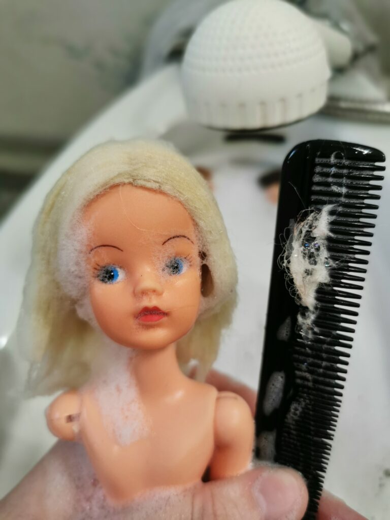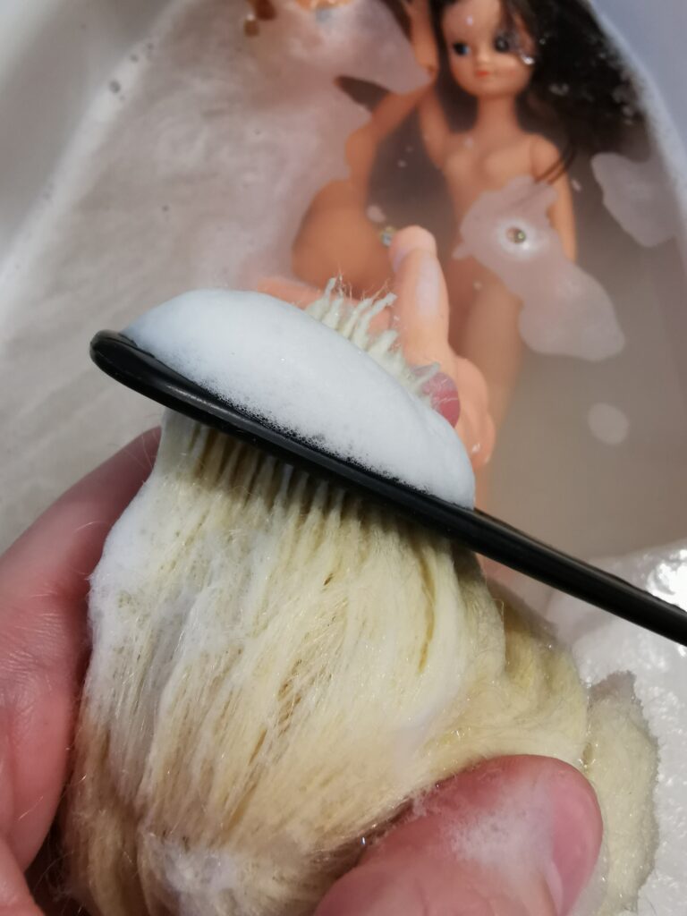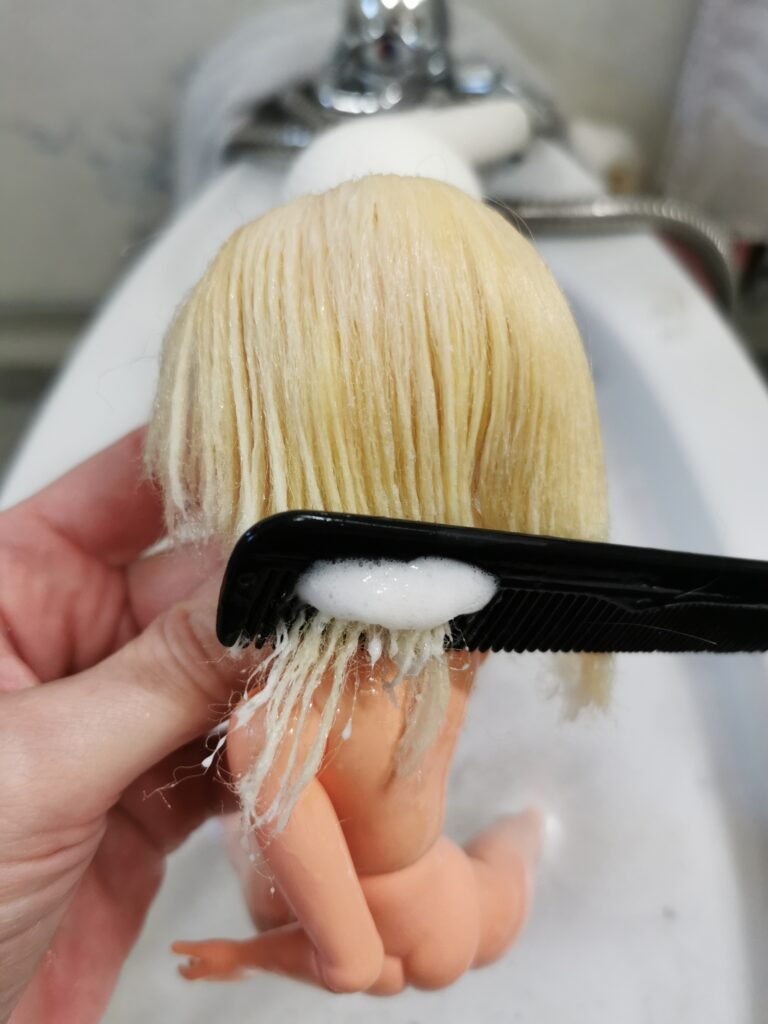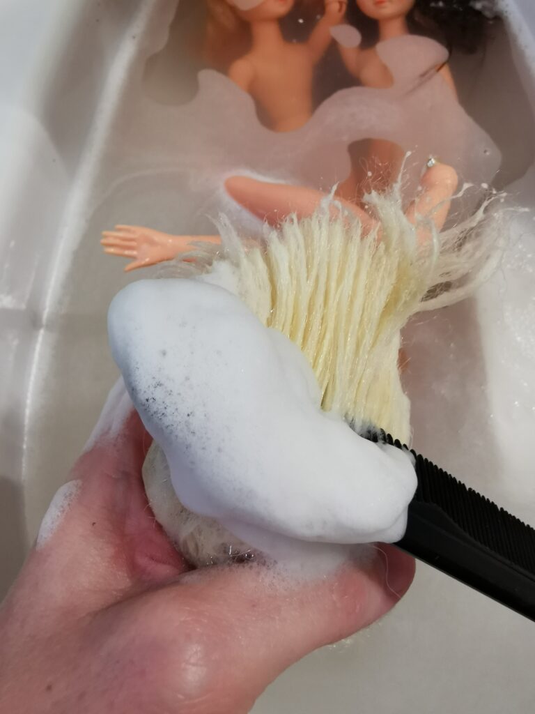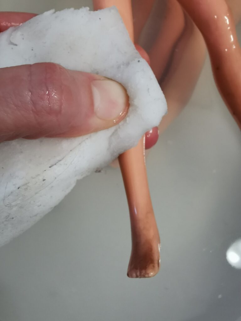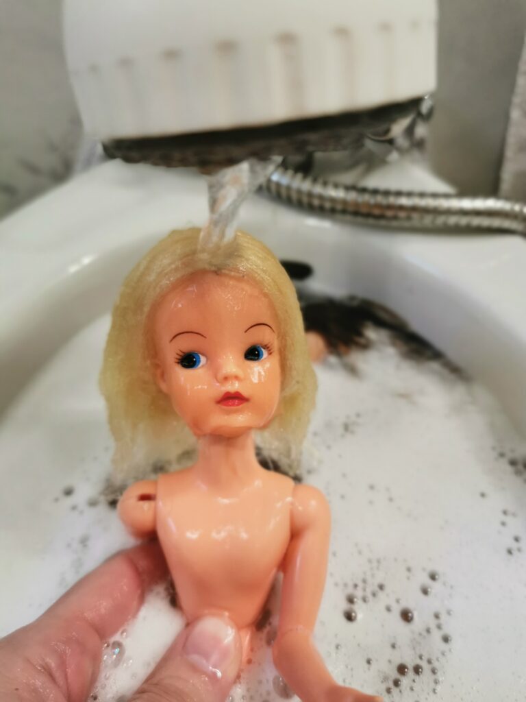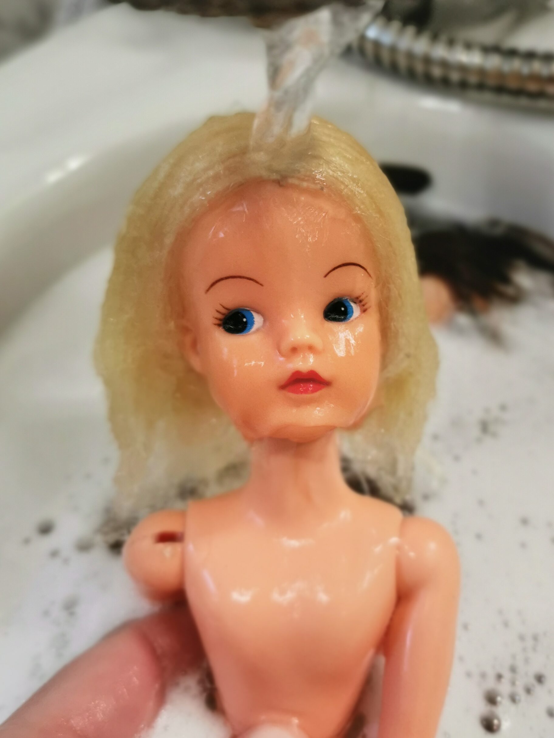 Start by rinsing in body-warm water.Use soft soap……and fill up with body-warm water.Let them be in the water for some minutes.Then use a magic sponge to carefully clean away the dirt,The left leg is sponged, the other not, yet.Time to wash the head.Use any shampoo you prefer!Be careful not to do anything about the parting in the hair (if it’s correct).Comb carefully.Make sure the dirt disappears. Luckily the shampoo doesn’t heart her eyes.Rinse.Then use any conditioner.Comb in the conditioner to the hair.Cut off damaged hair.Let her sit a while with the conditioner working in the hair.Rinse again.Dry the doll.When the body is cleaned and dry, put some baby powder on the rubbery parts and rub it in, to make them not so “sticky”.