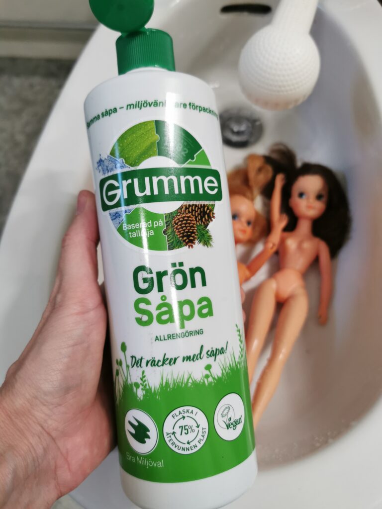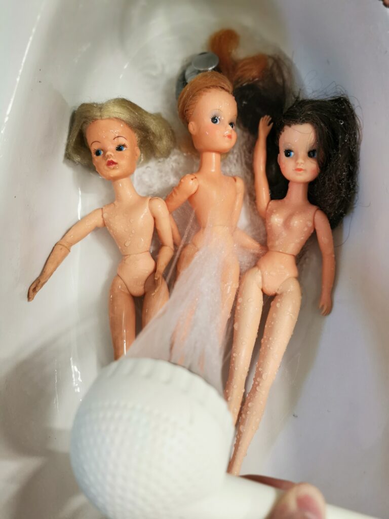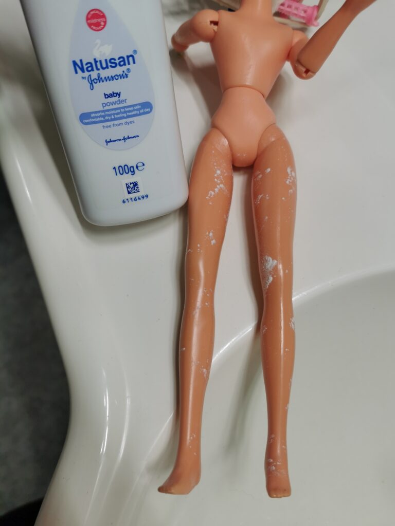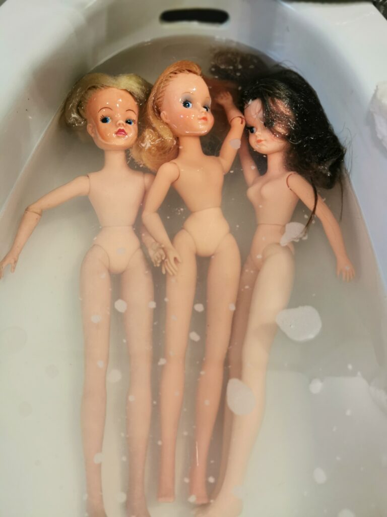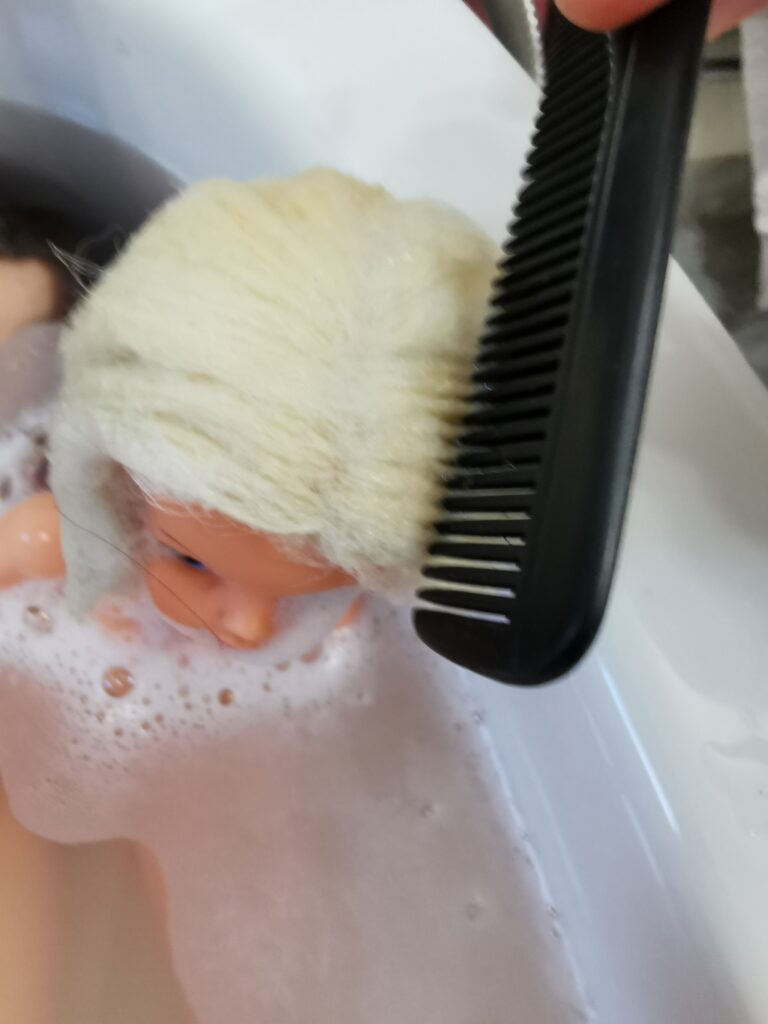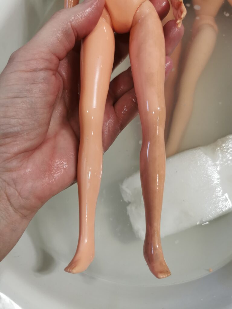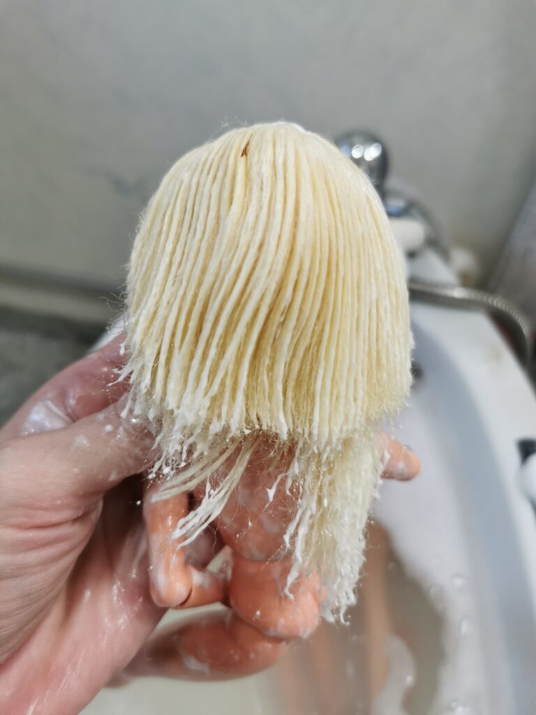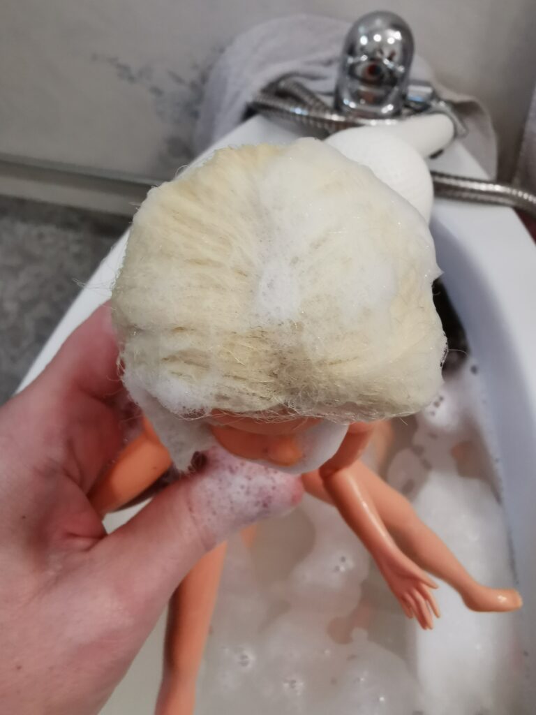 Start by rinsing in body-warm water.Use soft soap……and fill up with body-warm water.Let them be in the water for some minutes.Then use a magic sponge to carefully clean away the dirt,The left leg is sponged, the other not, yet.Time to wash the head.Use any shampoo you prefer!Be careful not to do anything about the parting in the hair (if it’s correct).Comb carefully.Make sure the dirt disappears. Luckily the shampoo doesn’t heart her eyes.Rinse.Then use any conditioner.Comb in the conditioner to the hair.Cut off damaged hair.Let her sit a while with the conditioner working in the hair.Rinse again.Dry the doll.When the body is cleaned and dry, put some baby powder on the rubbery parts and rub it in, to make them not so “sticky”.