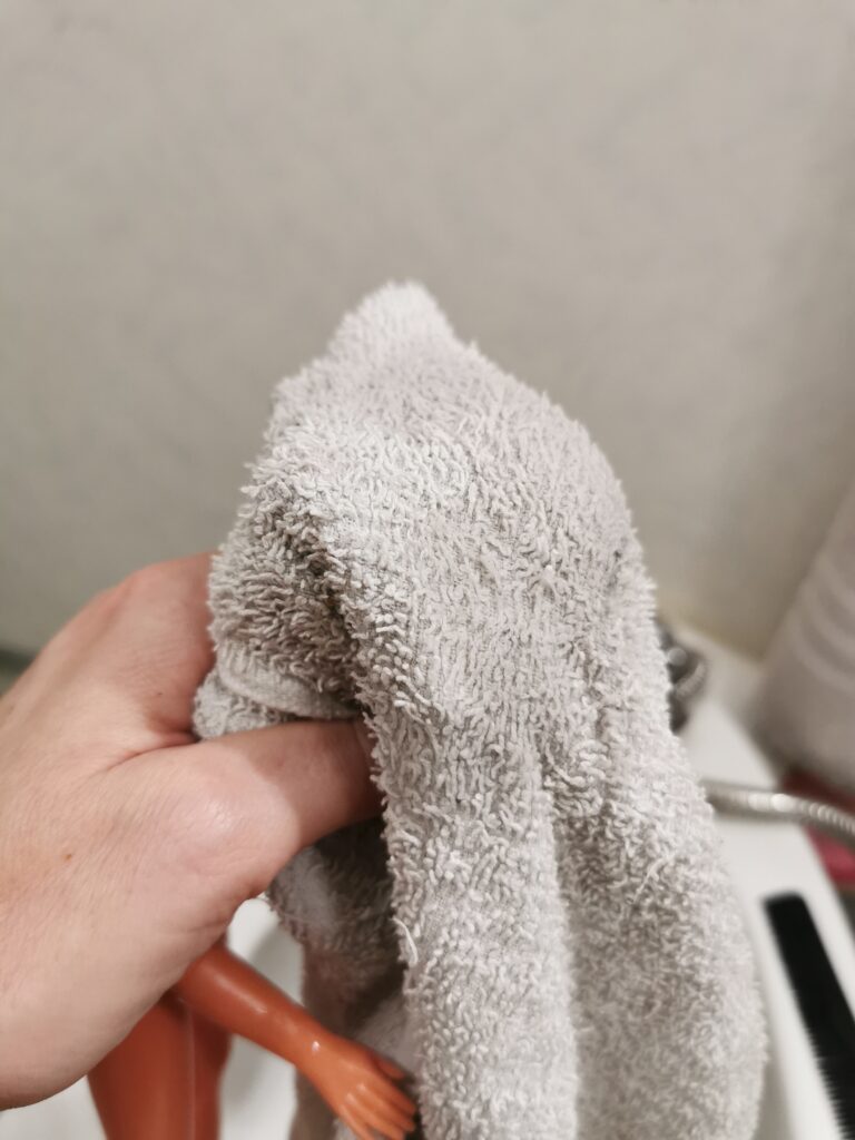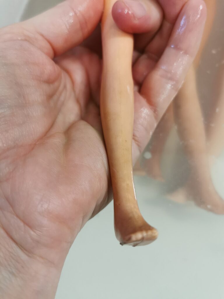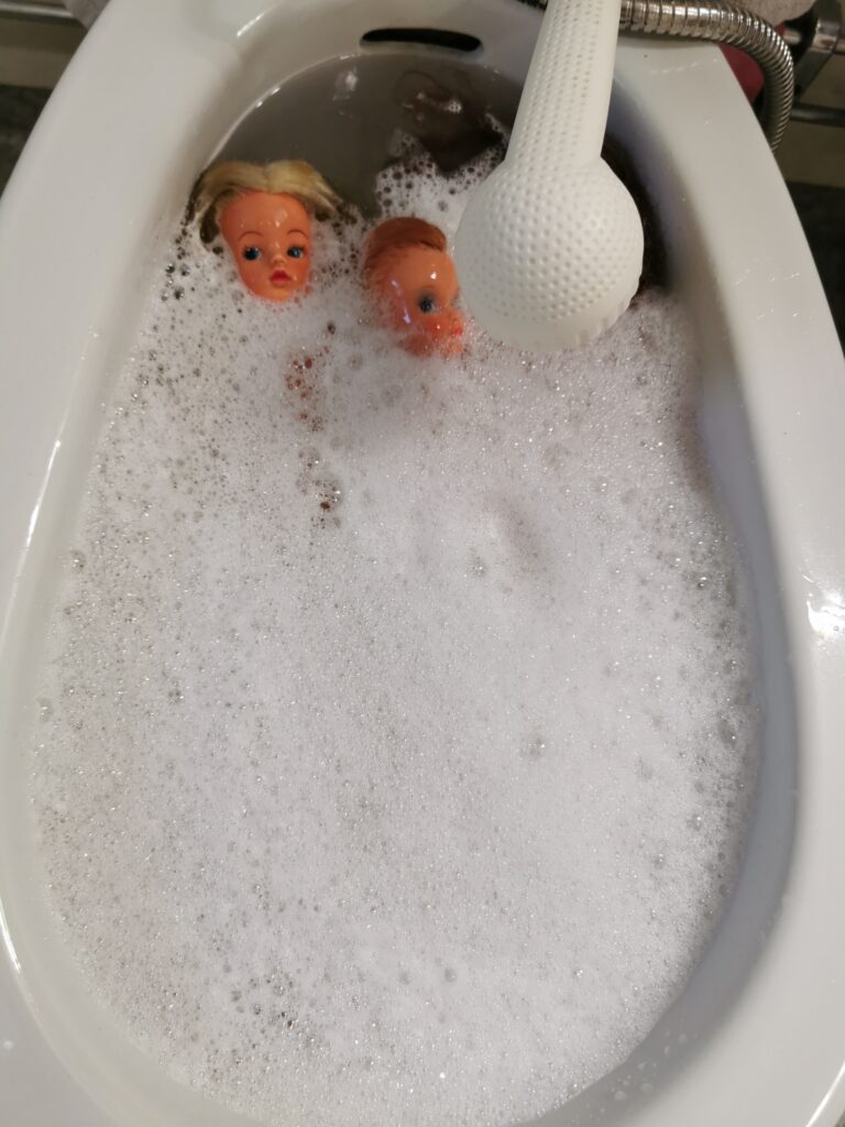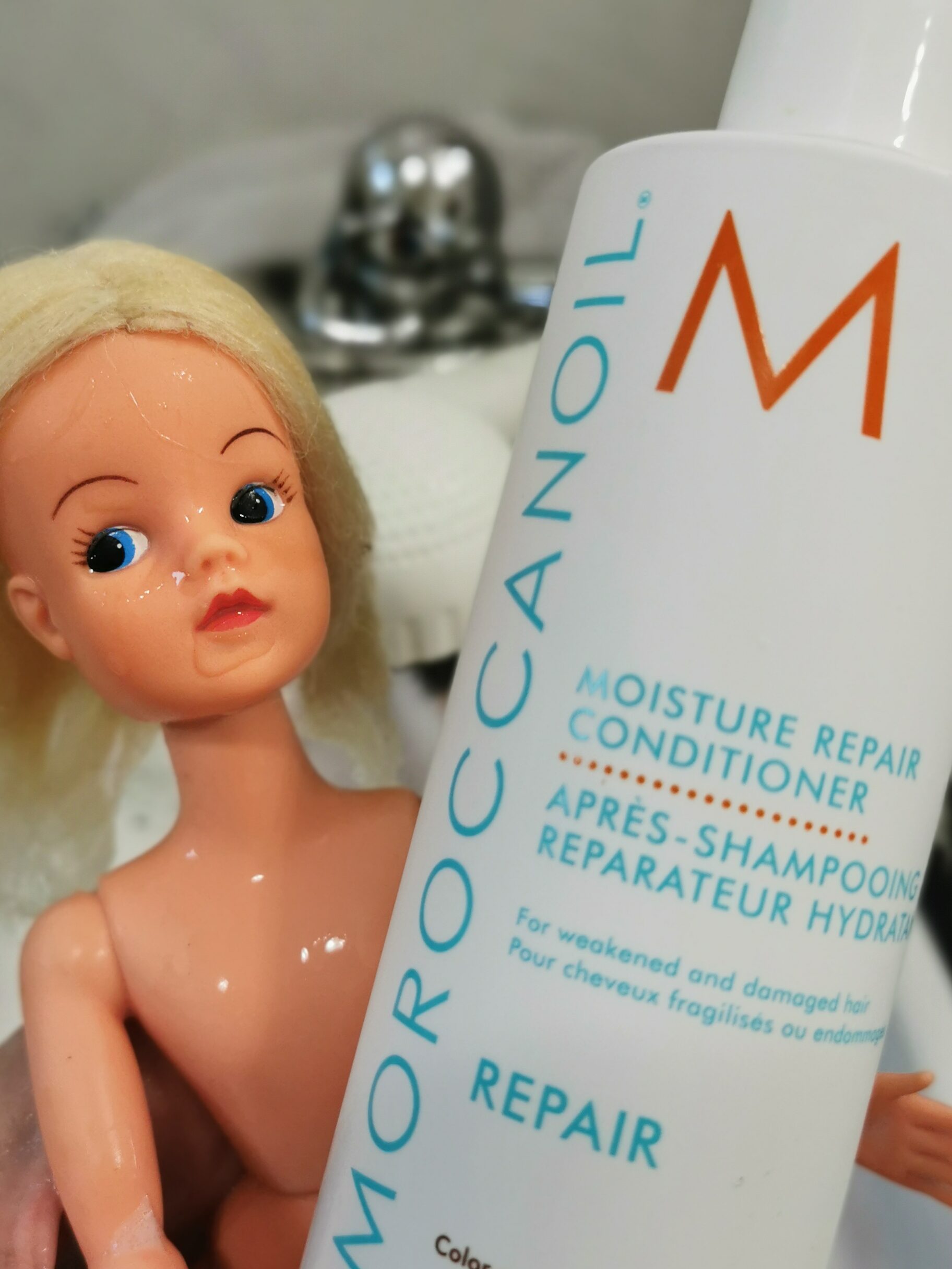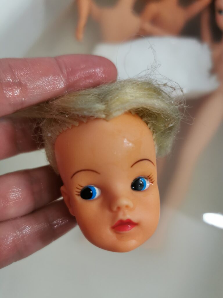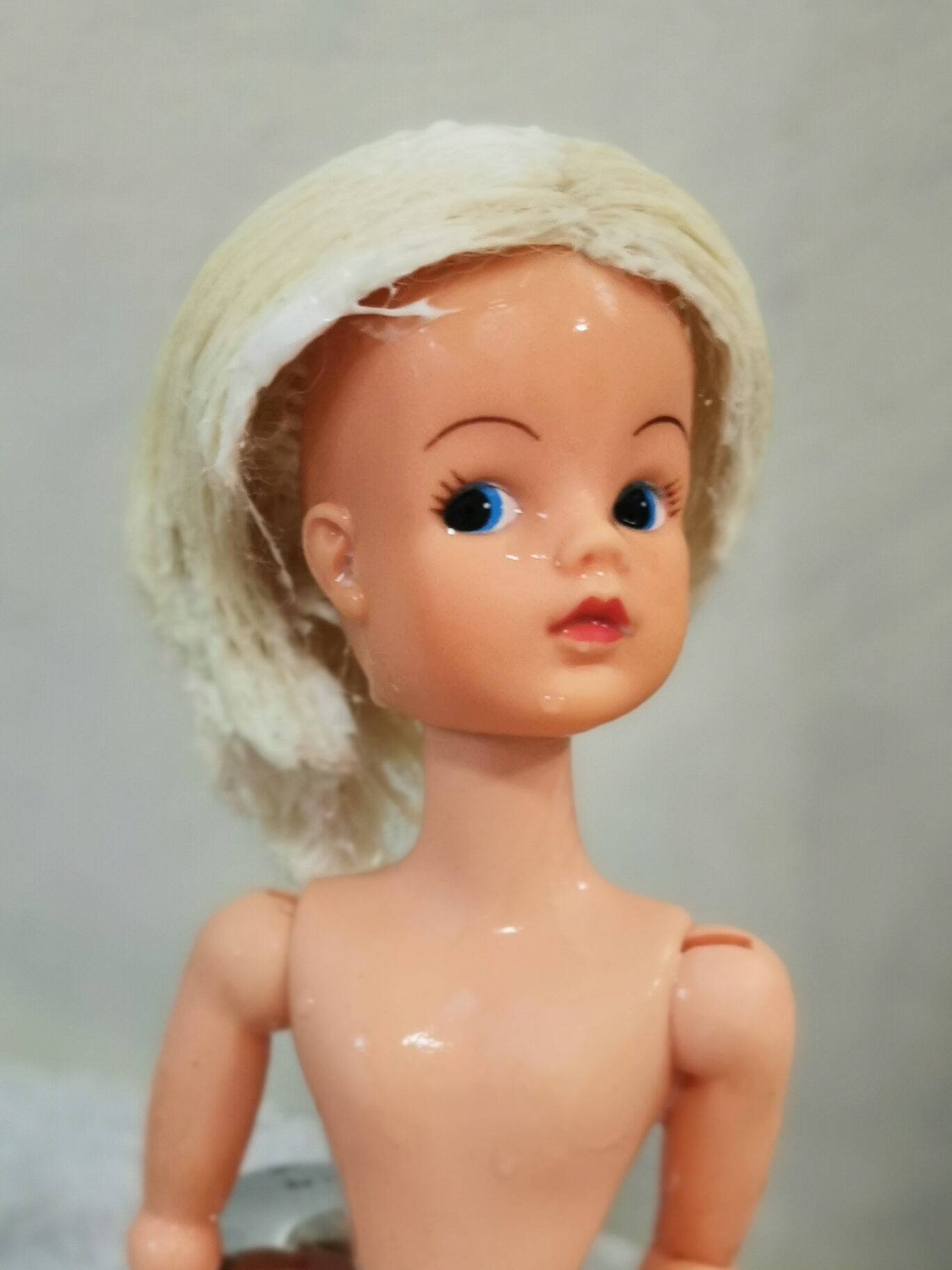 Start by rinsing in body-warm water.Use soft soap……and fill up with body-warm water.Let them be in the water for some minutes.Then use a magic sponge to carefully clean away the dirt,The left leg is sponged, the other not, yet.Time to wash the head.Use any shampoo you prefer!Be careful not to do anything about the parting in the hair (if it’s correct).Comb carefully.Make sure the dirt disappears. Luckily the shampoo doesn’t heart her eyes.Rinse.Then use any conditioner.Comb in the conditioner to the hair.Cut off damaged hair.Let her sit a while with the conditioner working in the hair.Rinse again.Dry the doll.When the body is cleaned and dry, put some baby powder on the rubbery parts and rub it in, to make them not so “sticky”.