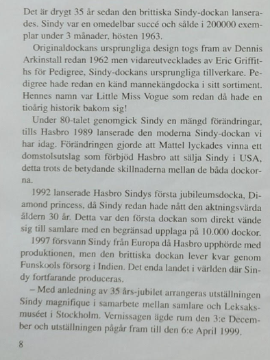 “Fredagen den 4:e december 1998 öppnades Sveriges hittills största utställning om Sindy dockan. Först på måndagen den 30:e november fick vi tillträde till utställningslokalen och hade därmed endast fyra stressiga dagar på oss att bygga upp utställningen innan vernissagen på fredagen kl. 12.