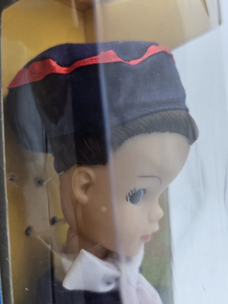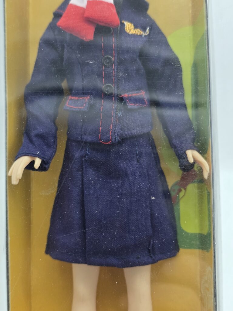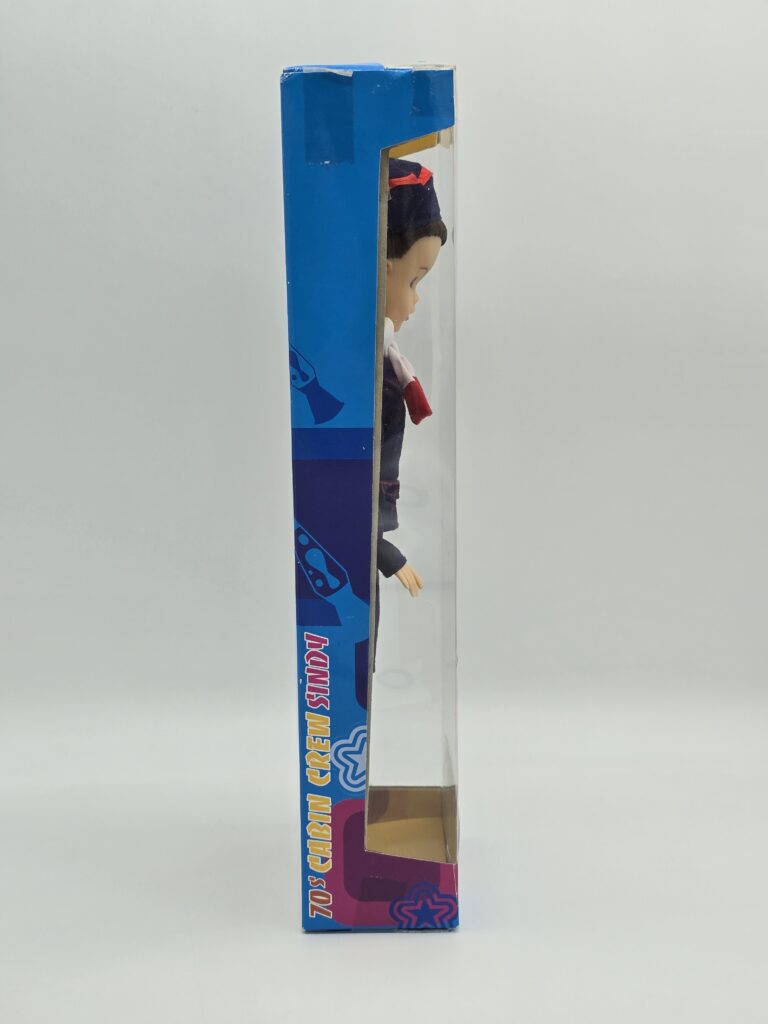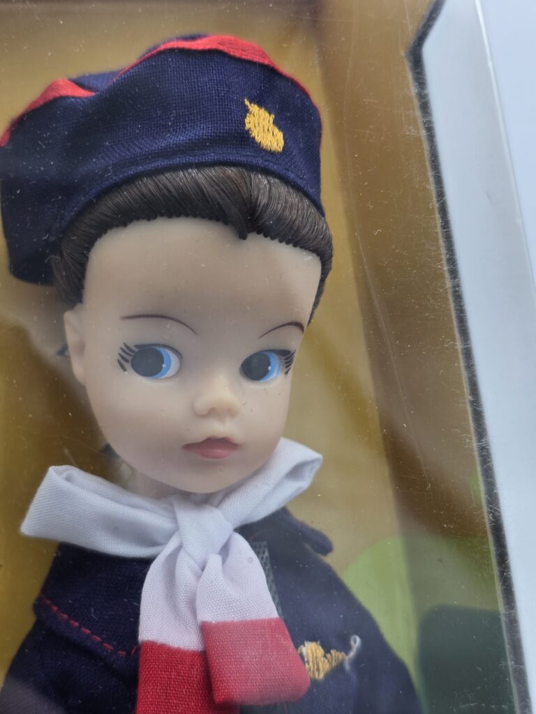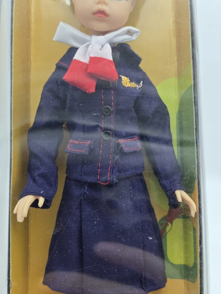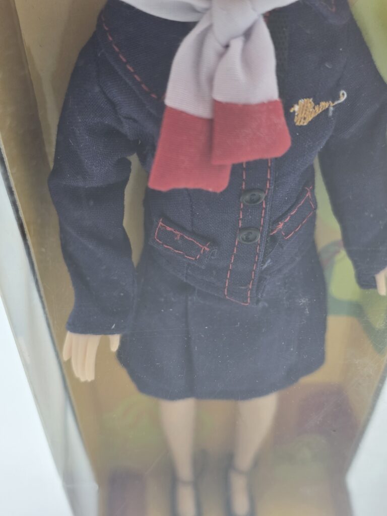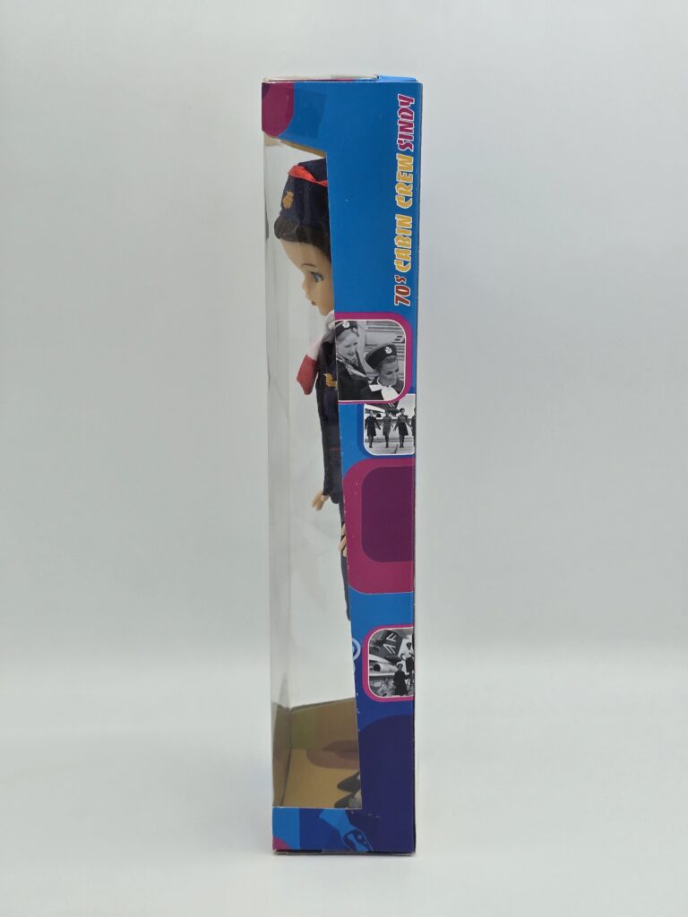 A reproduction doll released in the 2007 retro range, wearing four versions of the British European Airways (BEA) uniform of each era. She’s featuring the BEA uniform worn just before the merger with BOAC to form British Airways.