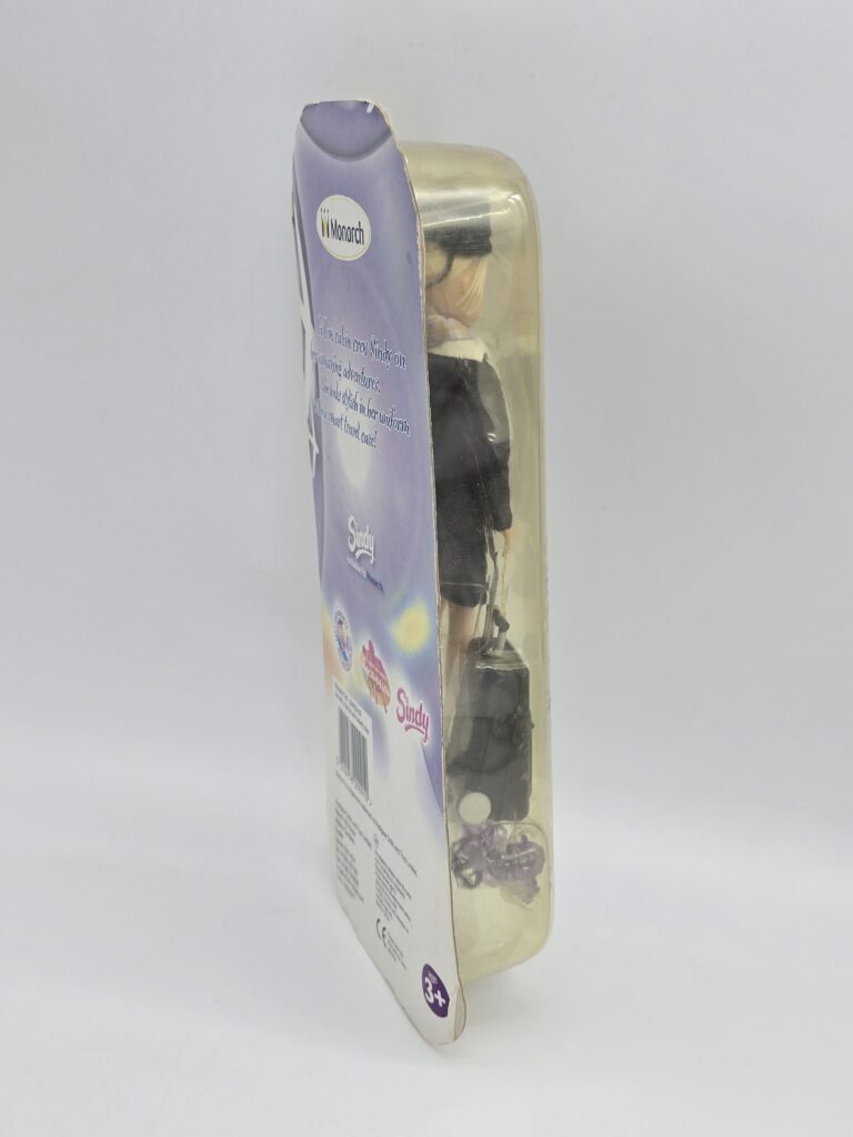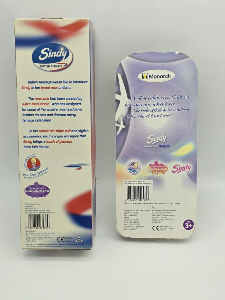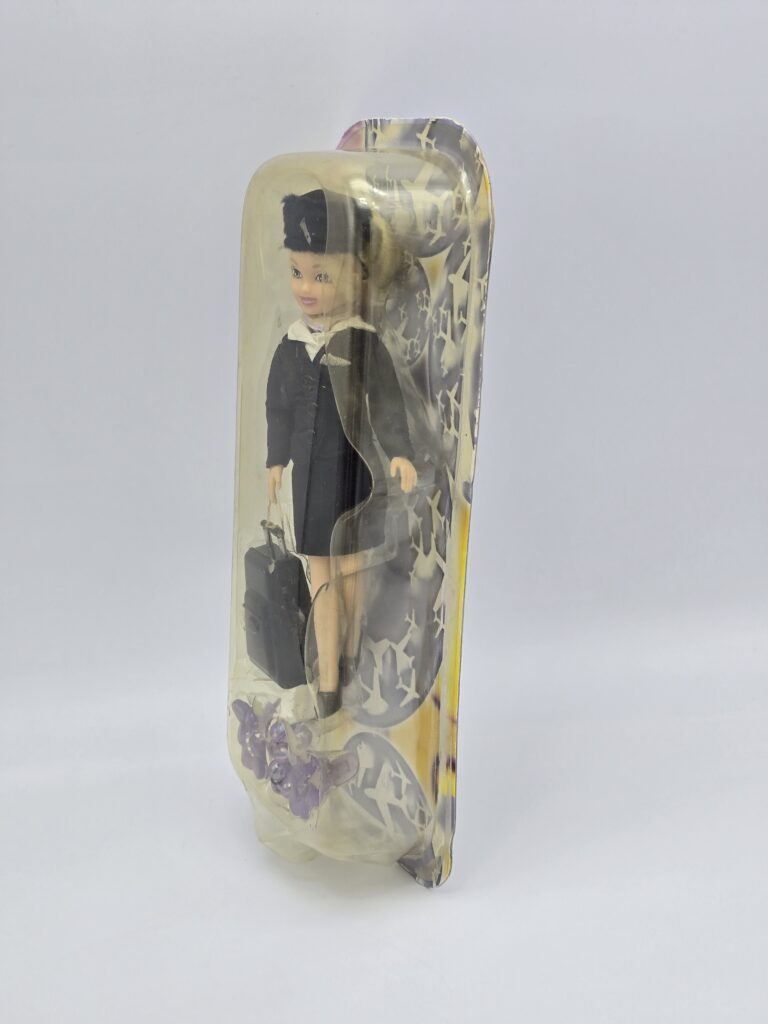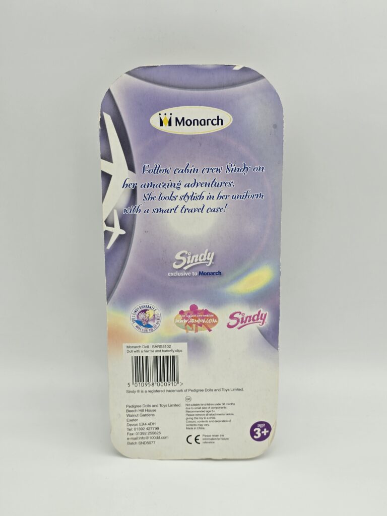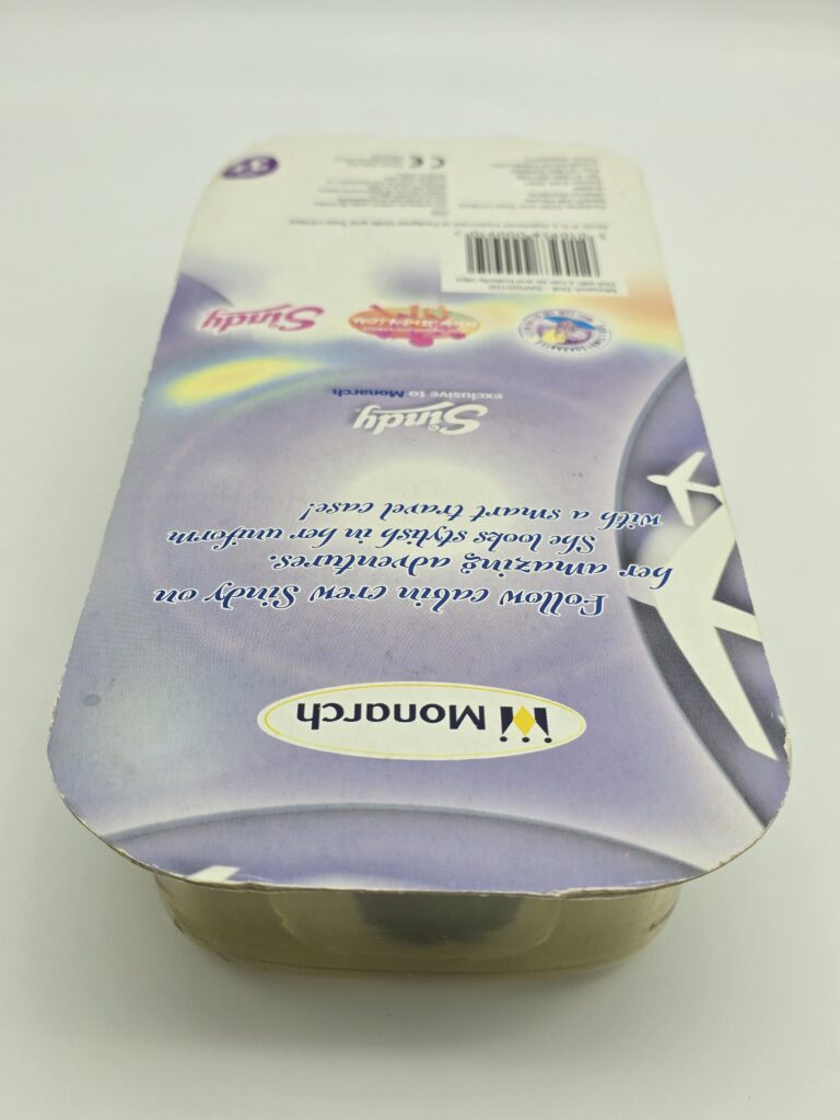 TLSM has been able to buy a boxed Monarch Cabin Crew Sindy, who’s the tiny New Moon 6.5″ doll. As far as TLSM can tell, she was produced around 2008. Monarch Airlines collaborated with Pedigree Dolls and Toys to create this cabin crew-themed Sindy doll as a promotional item, reflecting the airline’s branding and uniform styles.