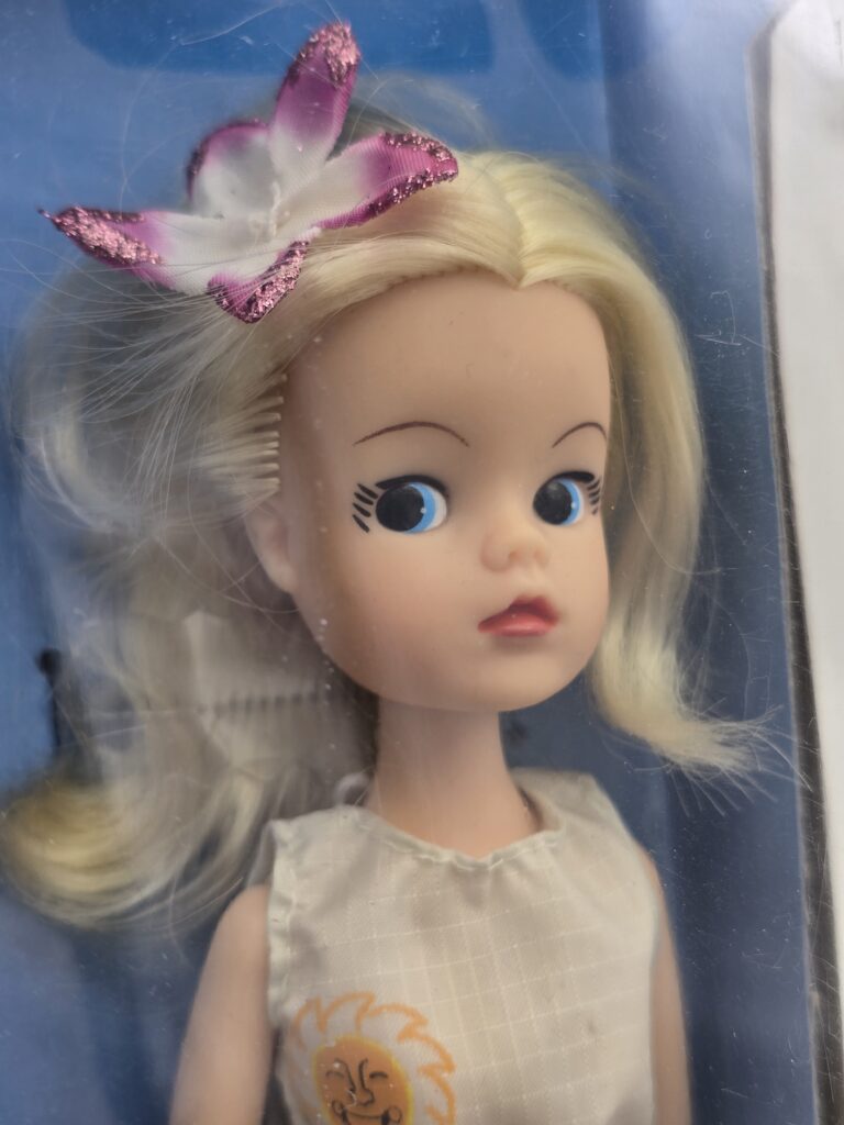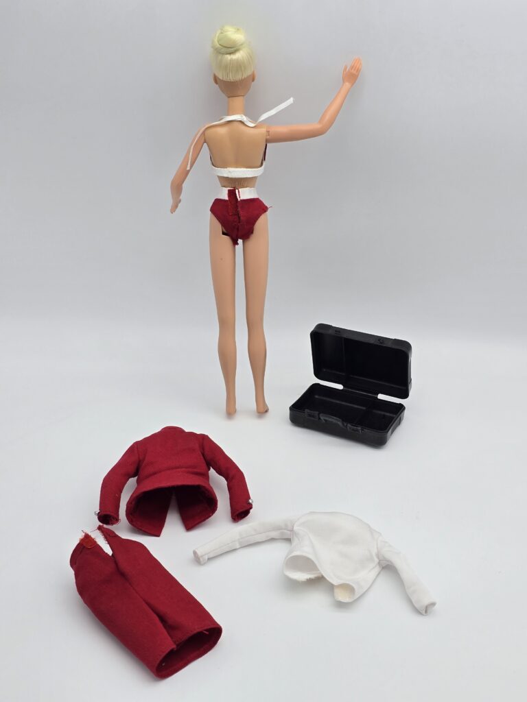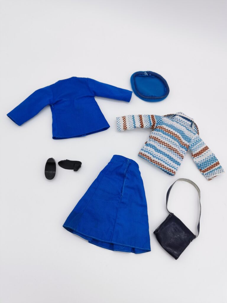 Sindy’s “High Fly and Play” pack, 12SWM. Pedigree did actually make Sindy as kind of a Cabin Crew Doll already in 1969, with their combined pack with an off duty Weekender Sindy doll that also has her “when duty calls” trim navy air hostess uniform and accessories.