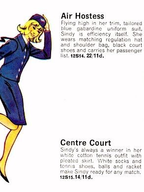 There were also Cabin Crew Uniforms made and sold as outfits for Sindy dolls during the years. They could be bought in the usual toy stores.