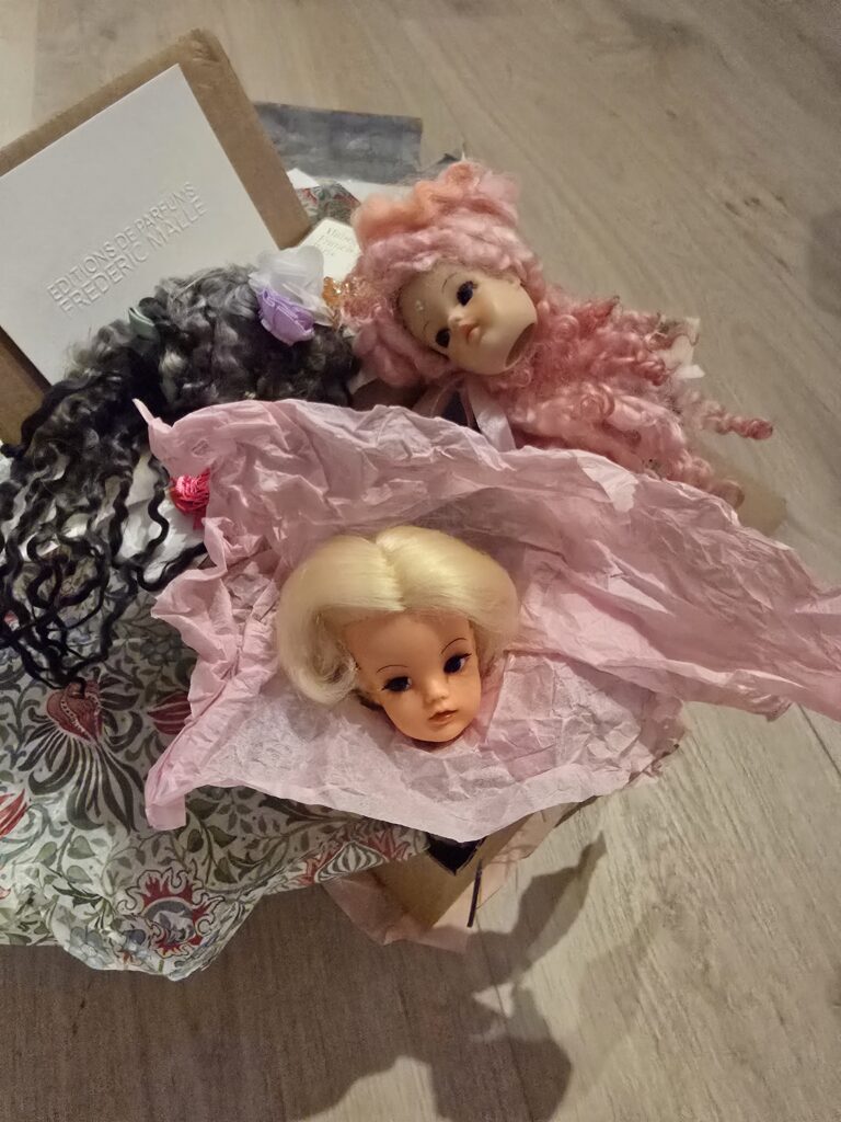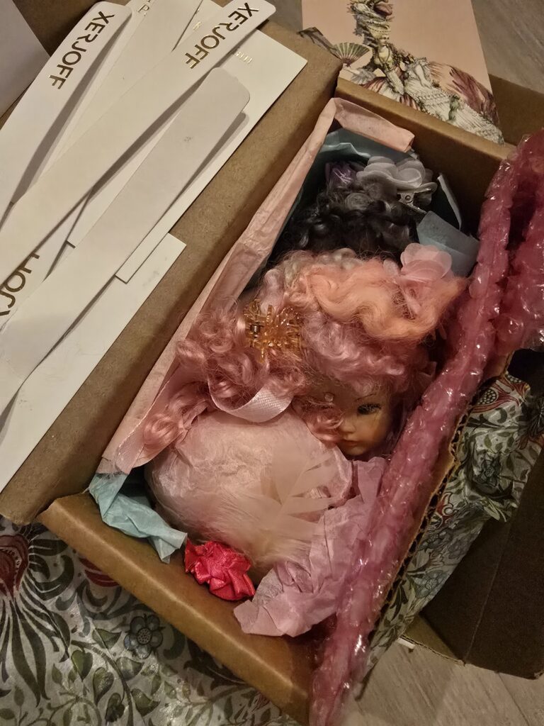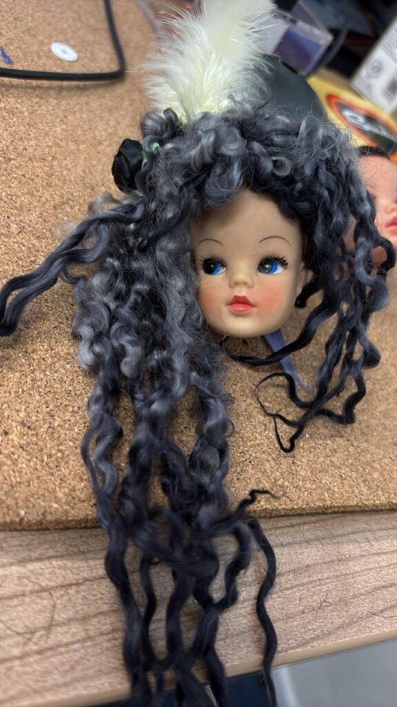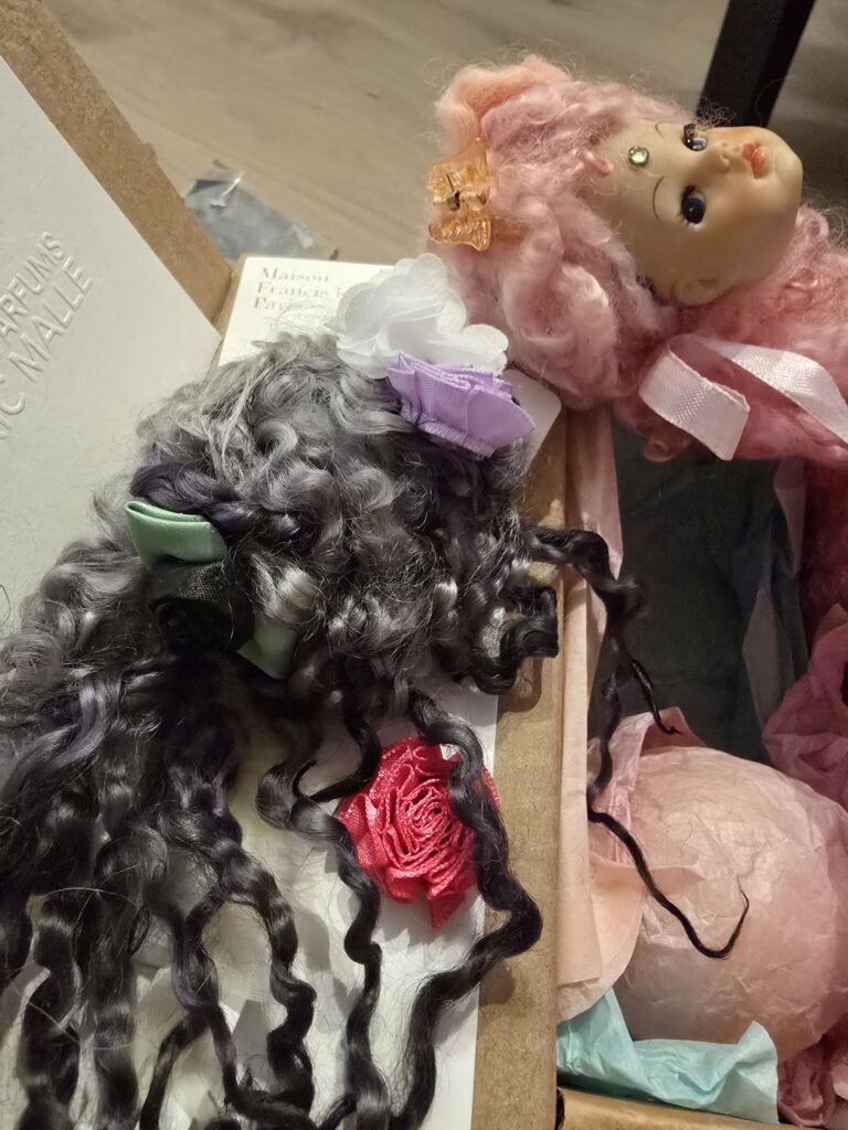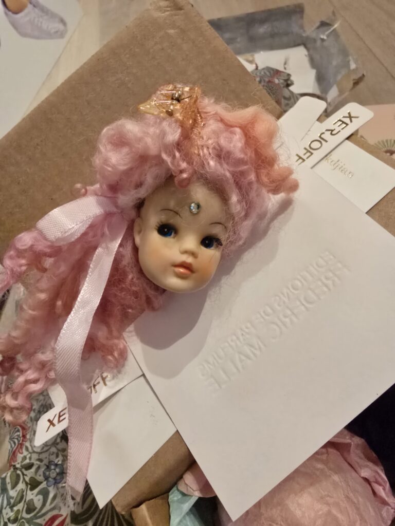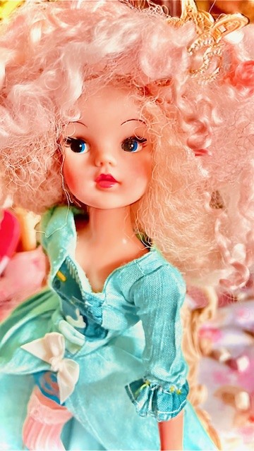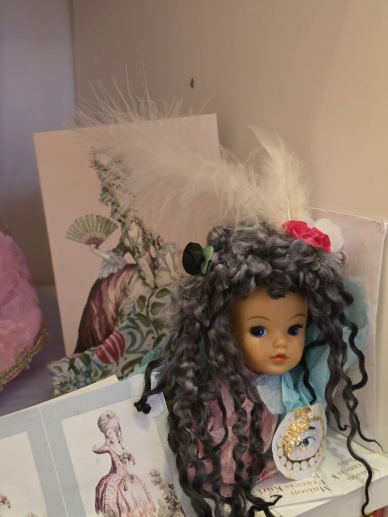 Sometimes Lucy collaborates with Chrissy Roberts known for her “Sindy Fashions by Chrissy” and below you can see Lucy’s wigs, one on a Gauntlet Sindy wearing a Rococo outfit created by Chrissy and another on a Sindy head surrounded by Lucy’s packing supply!
