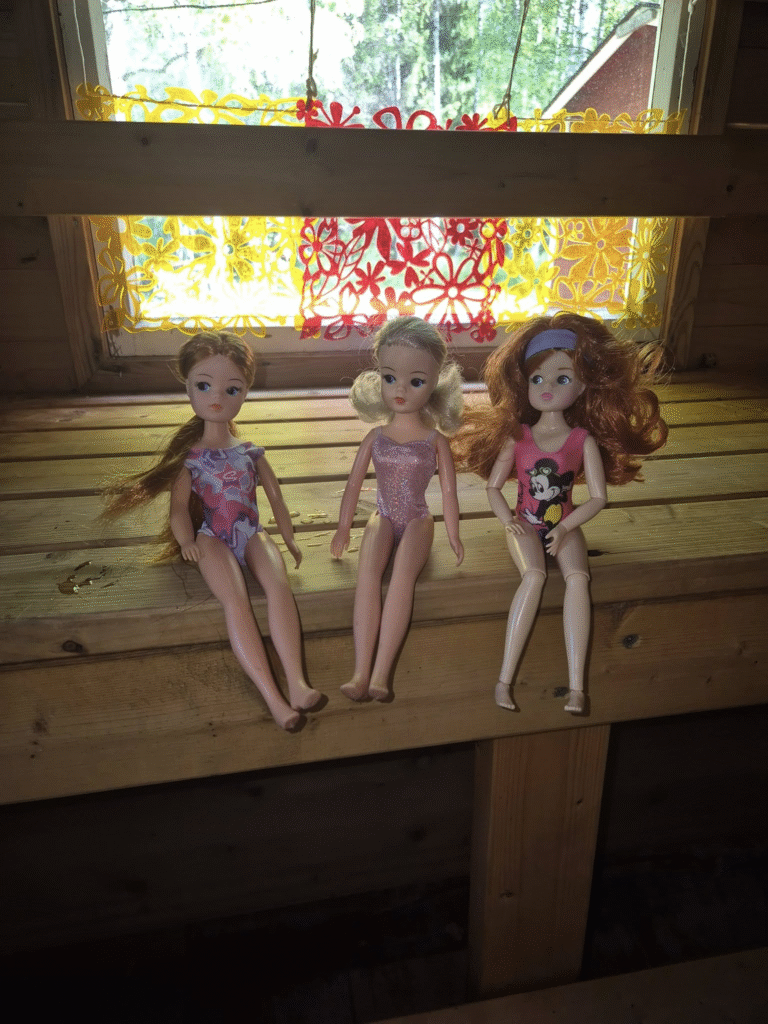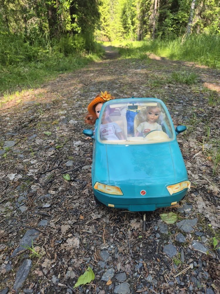 First girls took a car and drove to the summercottage for finnish midsummer festival. Travelling Sindy was a bit confused about the car: in her mind the steering wherl was on the wrong side of the car…